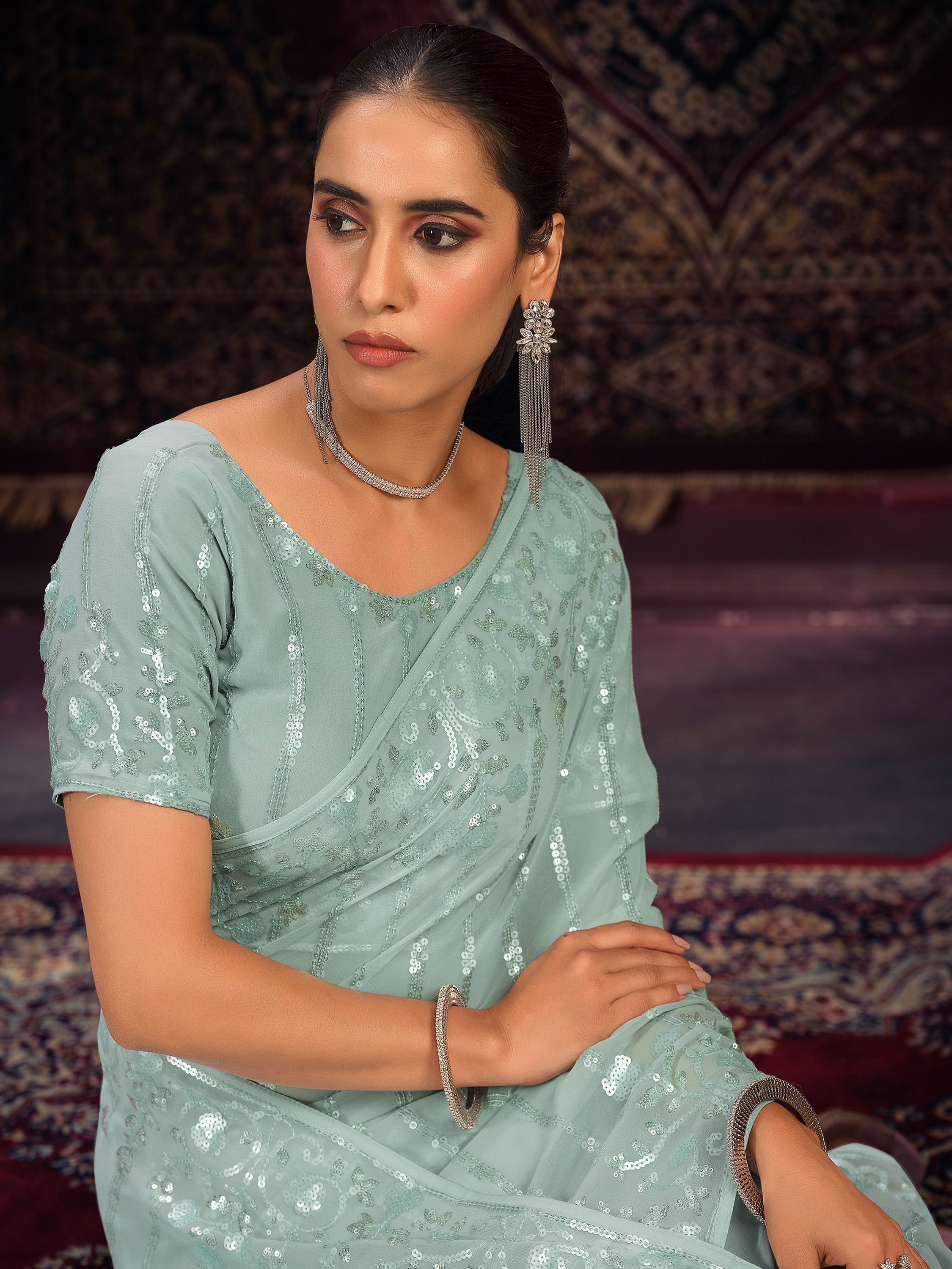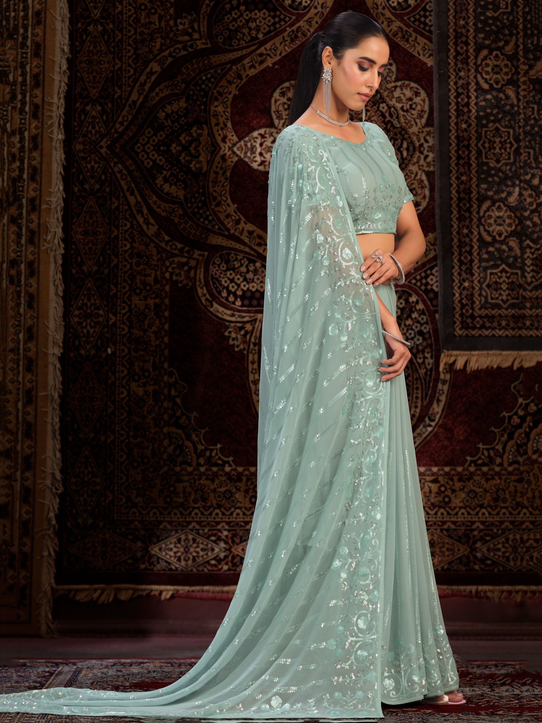 Sea Green Floral Embroidered Saree features a georgette saree with embroidery. Comes with georgette embroidered blouse.