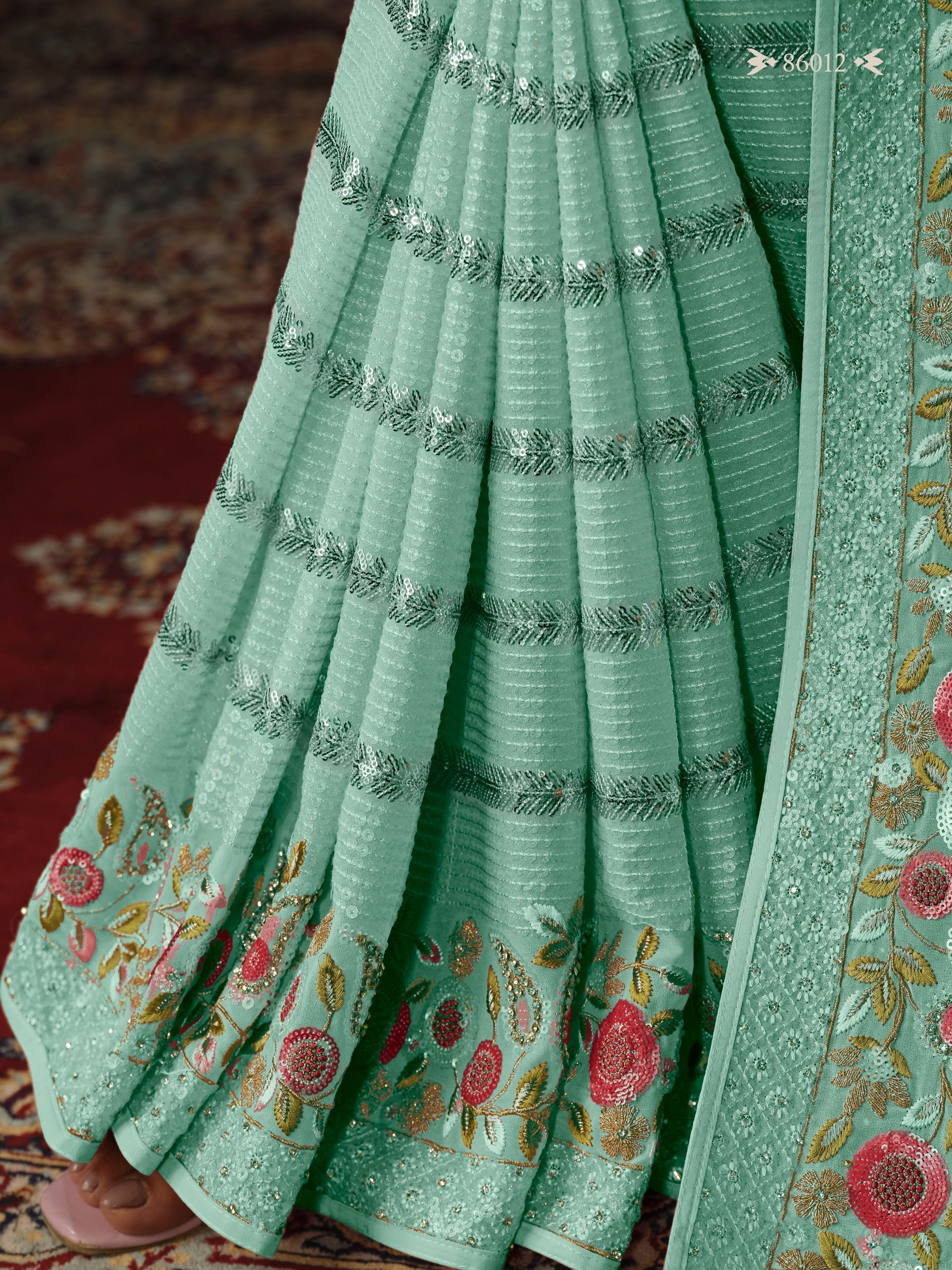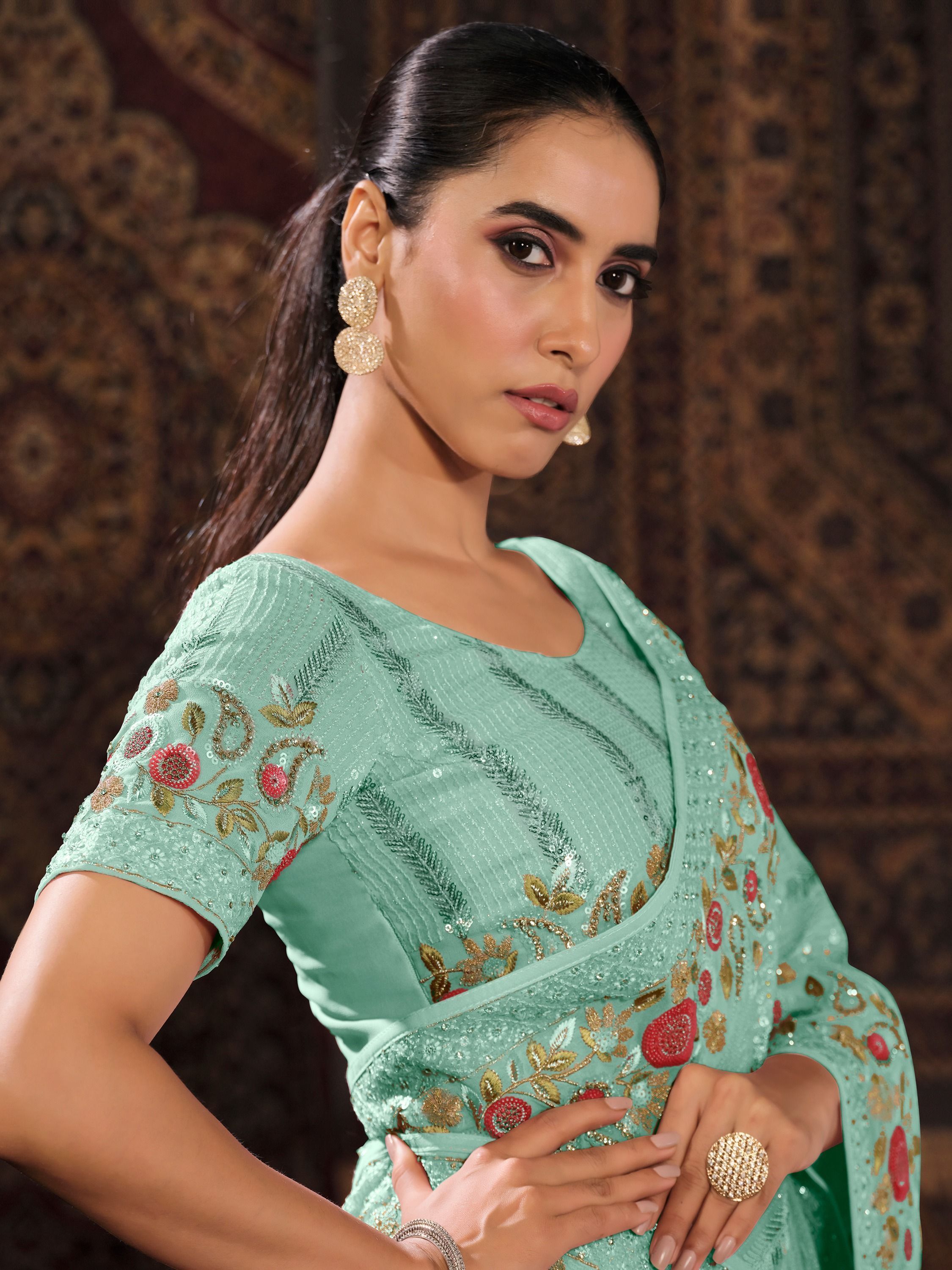 Sea Green Floral Embroidered Saree features a georgette saree with embroidery. Comes with georgette embroidered blouse. with sequins, zarkan, thread, zari work.