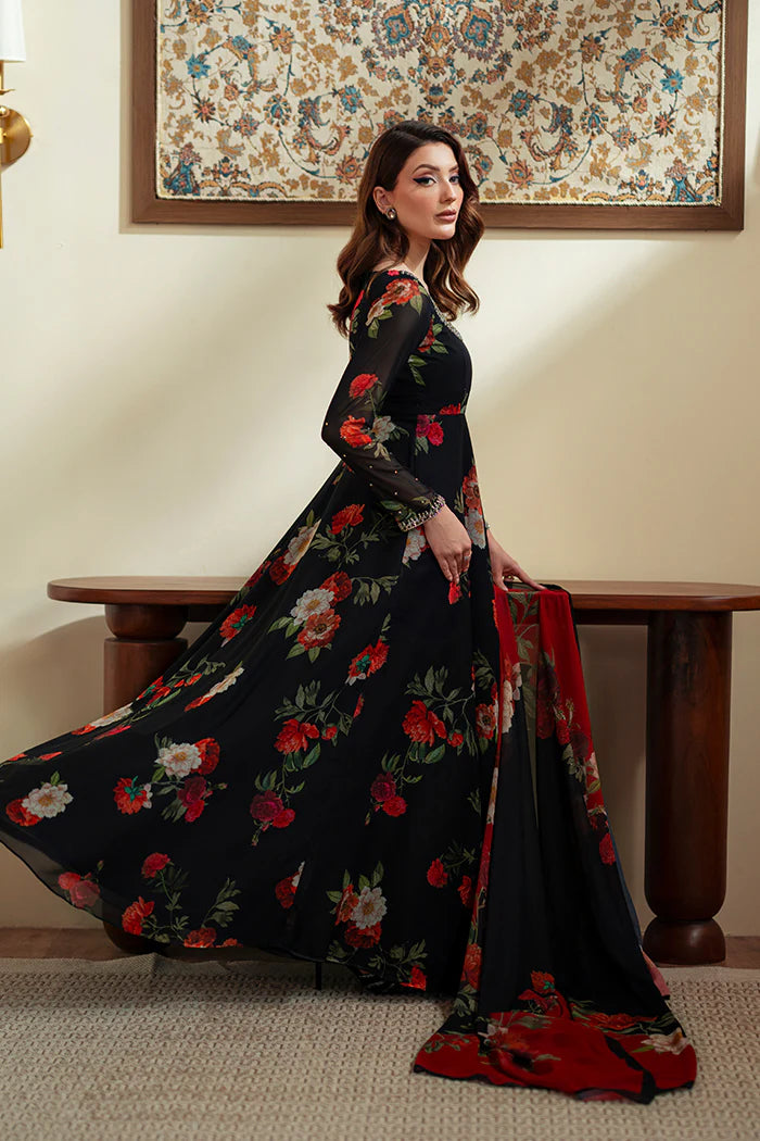 Crafted with elegance, this ensemble features a flowy chiffon frock adorned with delicate floral patterns, paired seamlessly with a luxurious silk dupatta. The hand-embellished neckline and sleeves add a touch of artisanal charm, making it a timeless statement of grace and sophistication.