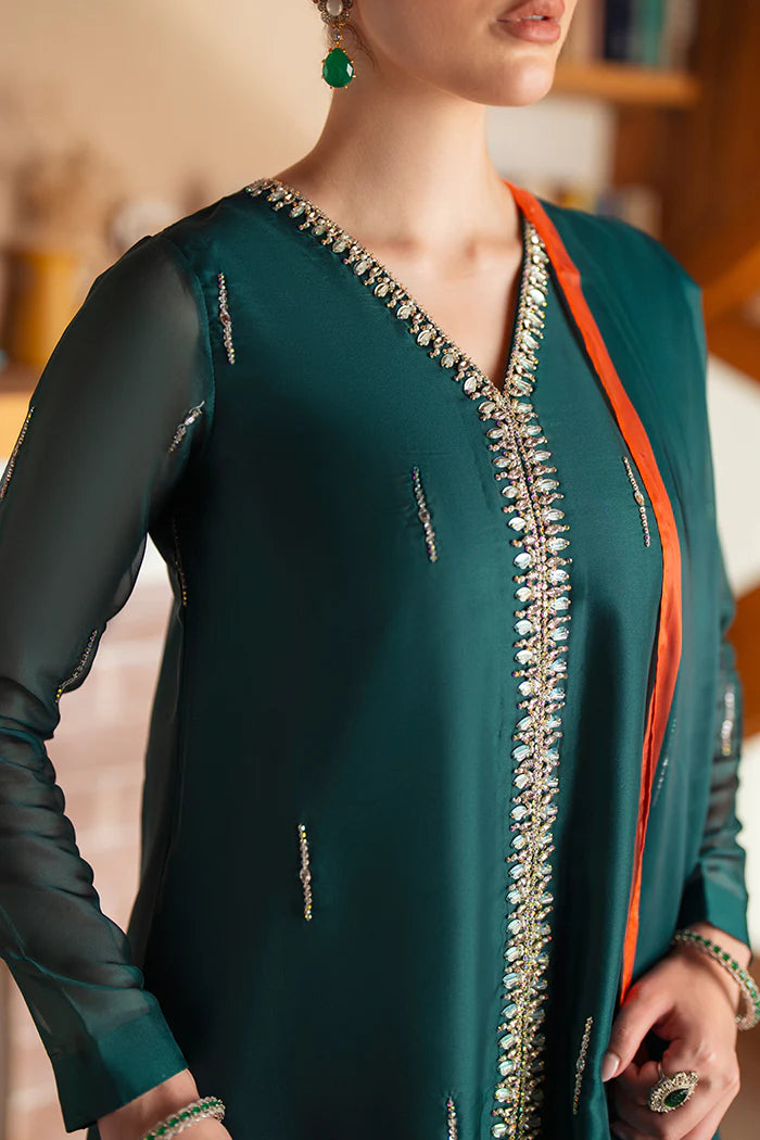 Crafted in luxurious silk, this rich green shirt features intricate hand embellishment along the neckline and front. Paired with a printed silk dupatta, this timeless festive ensemble blends sophistication with grace.