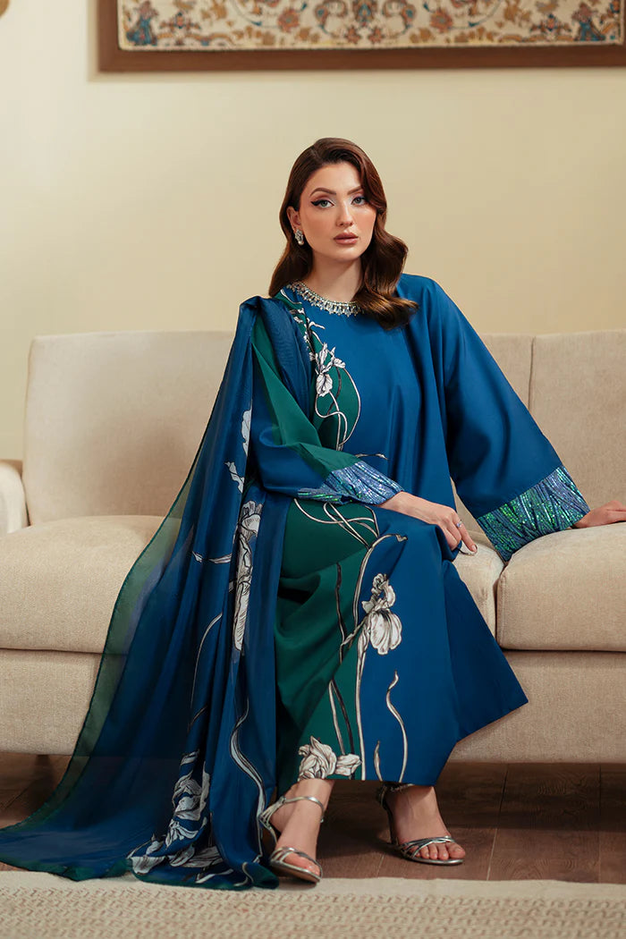 A rich blue crepe Kaftan adorned with delicate hand embellishment on the neckline and shimmering sequin work on the sleeves. Paired with matching crepe trousers and a flowy silk dupatta, the outfit is beautifully enhanced with floral patterns, making it a perfect pick for formal and festive occasions.