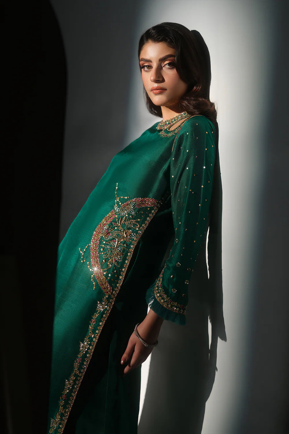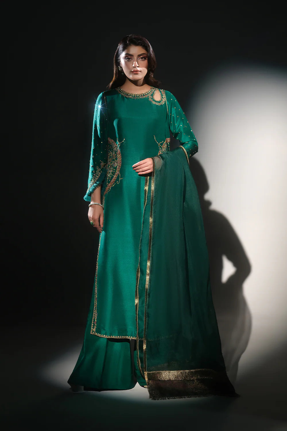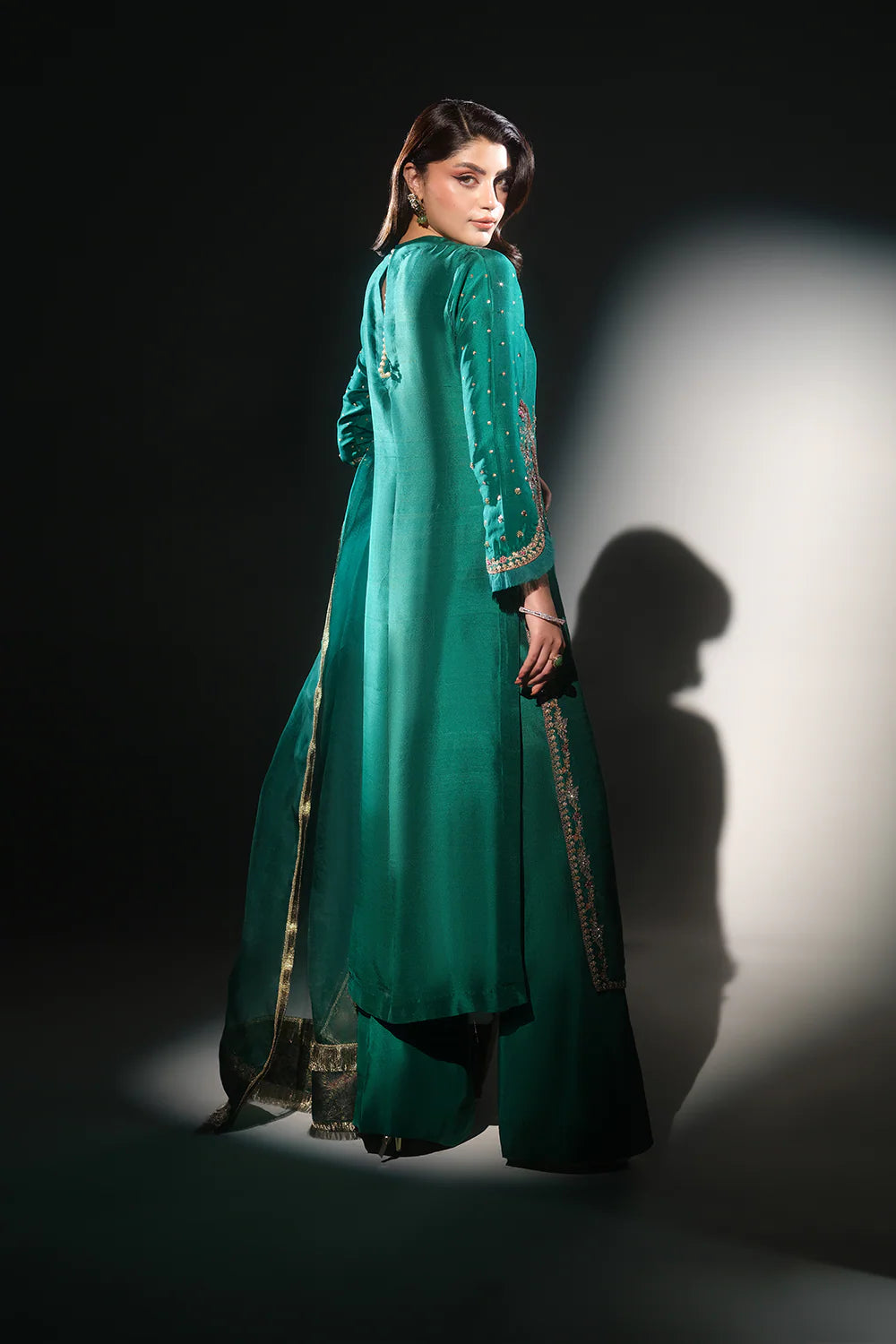 The ensemble is elevated by delicate embroidery on the neckline and pockets, adding a touch of luxury and intricate detailing that highlights expert craftsmanship. The look is completed with a sheer organza dupatta, adding an ethereal touch with its lightweight texture and graceful drape.
