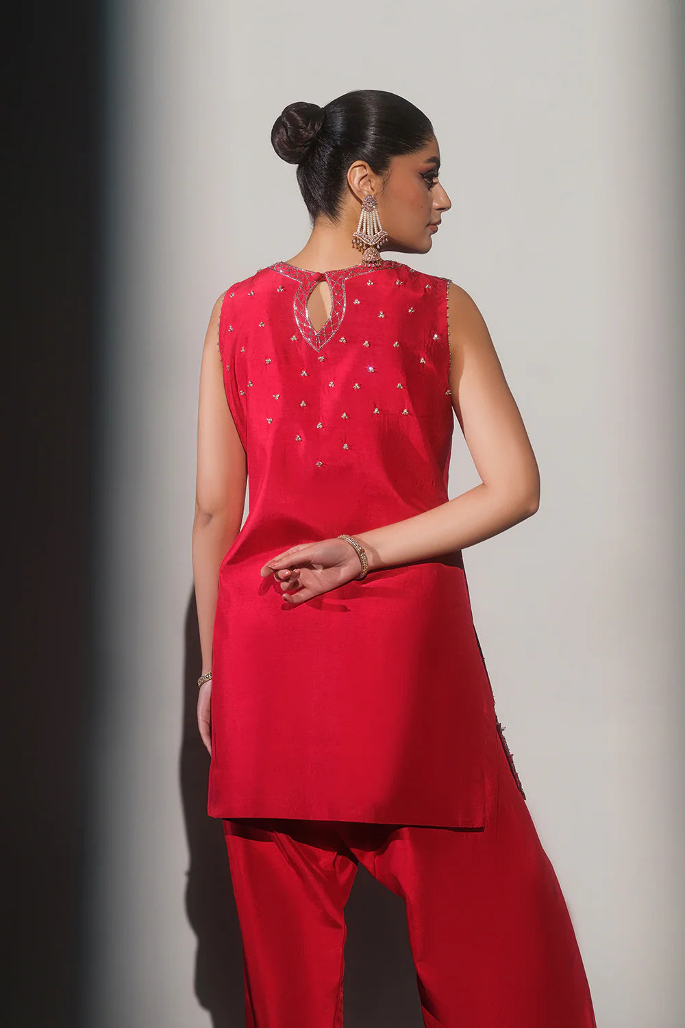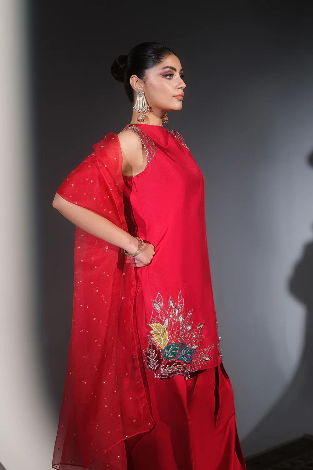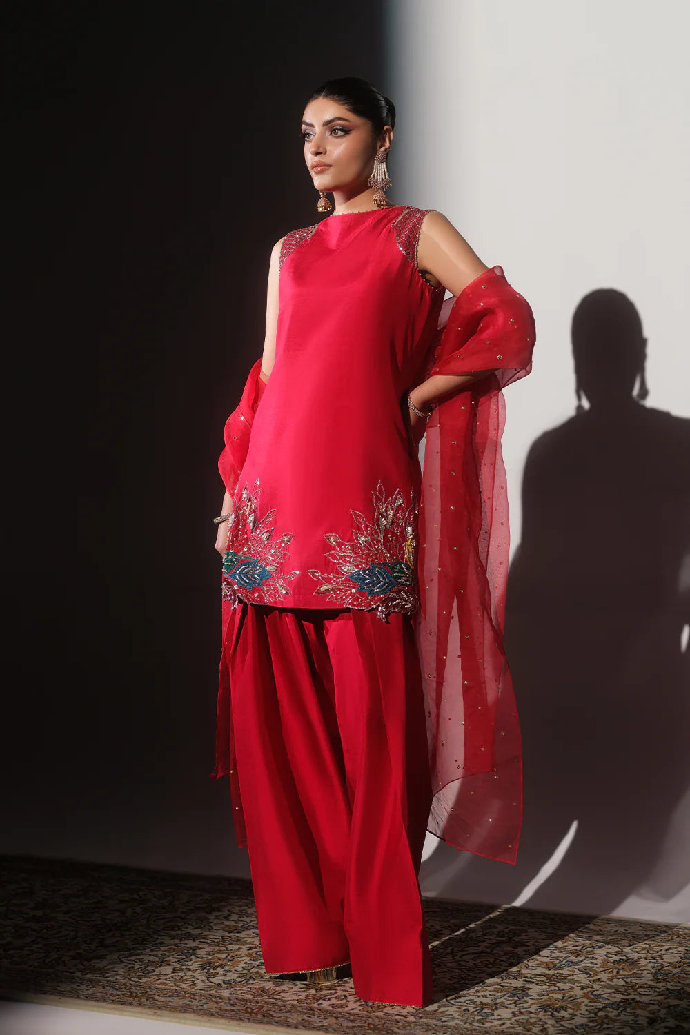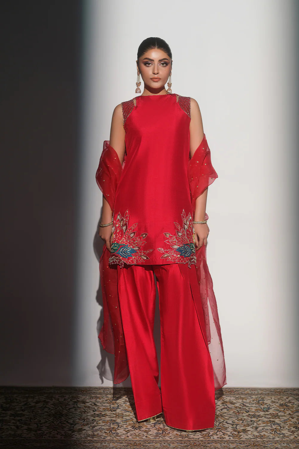 Turn heads with this vibrant and elegant Red Short Shirt and Salwar Set, a perfect blend of traditional charm and contemporary style. The short shirt is adorned with intricate hand embroidery, sparkling stones, and appliqué floral patterns delicately placed on both sides of the borders, adding a touch of sophistication and artistry.