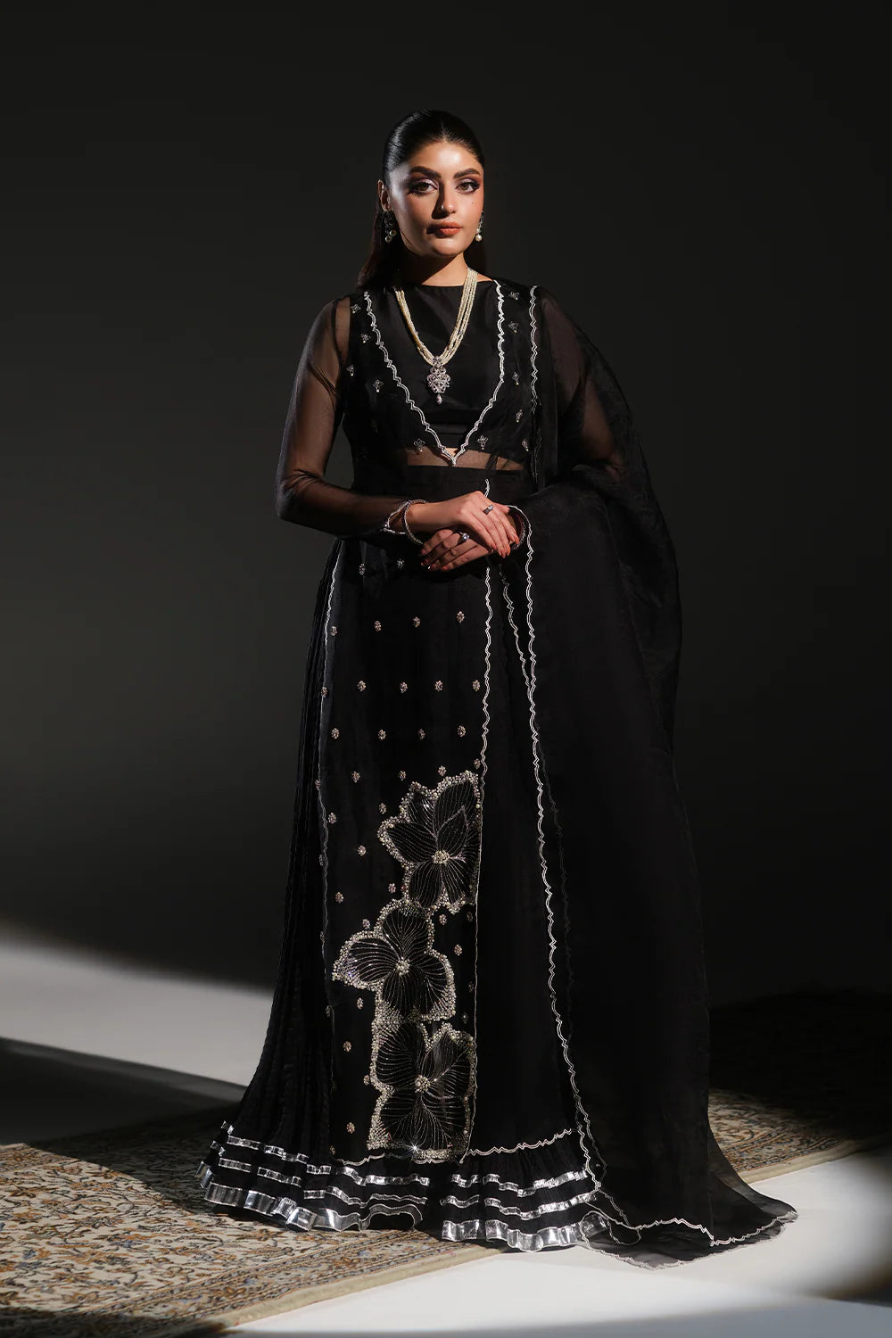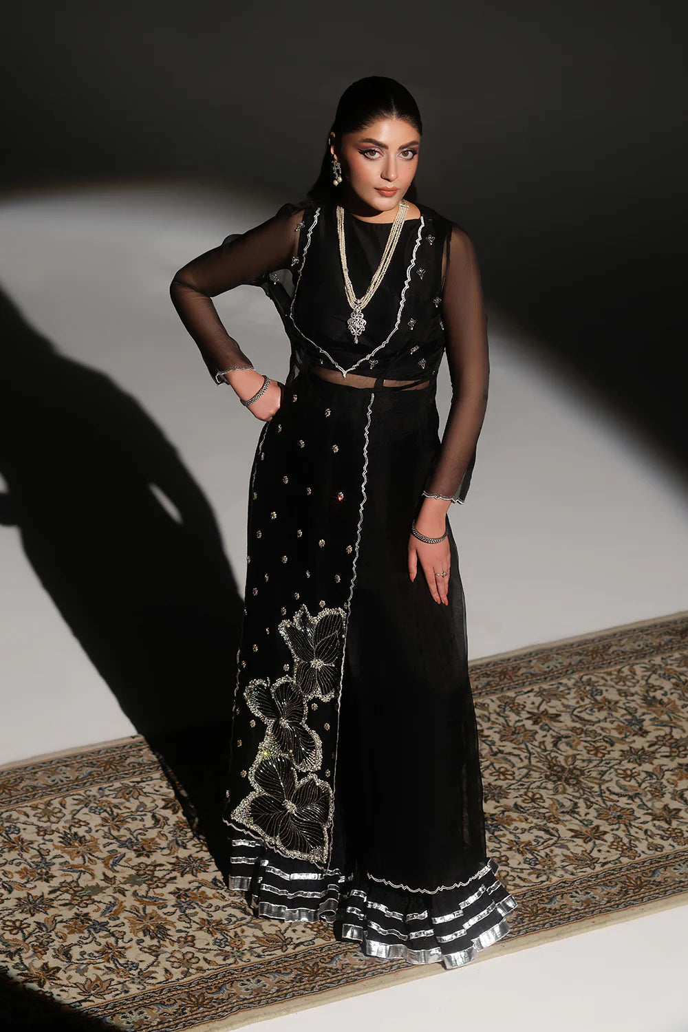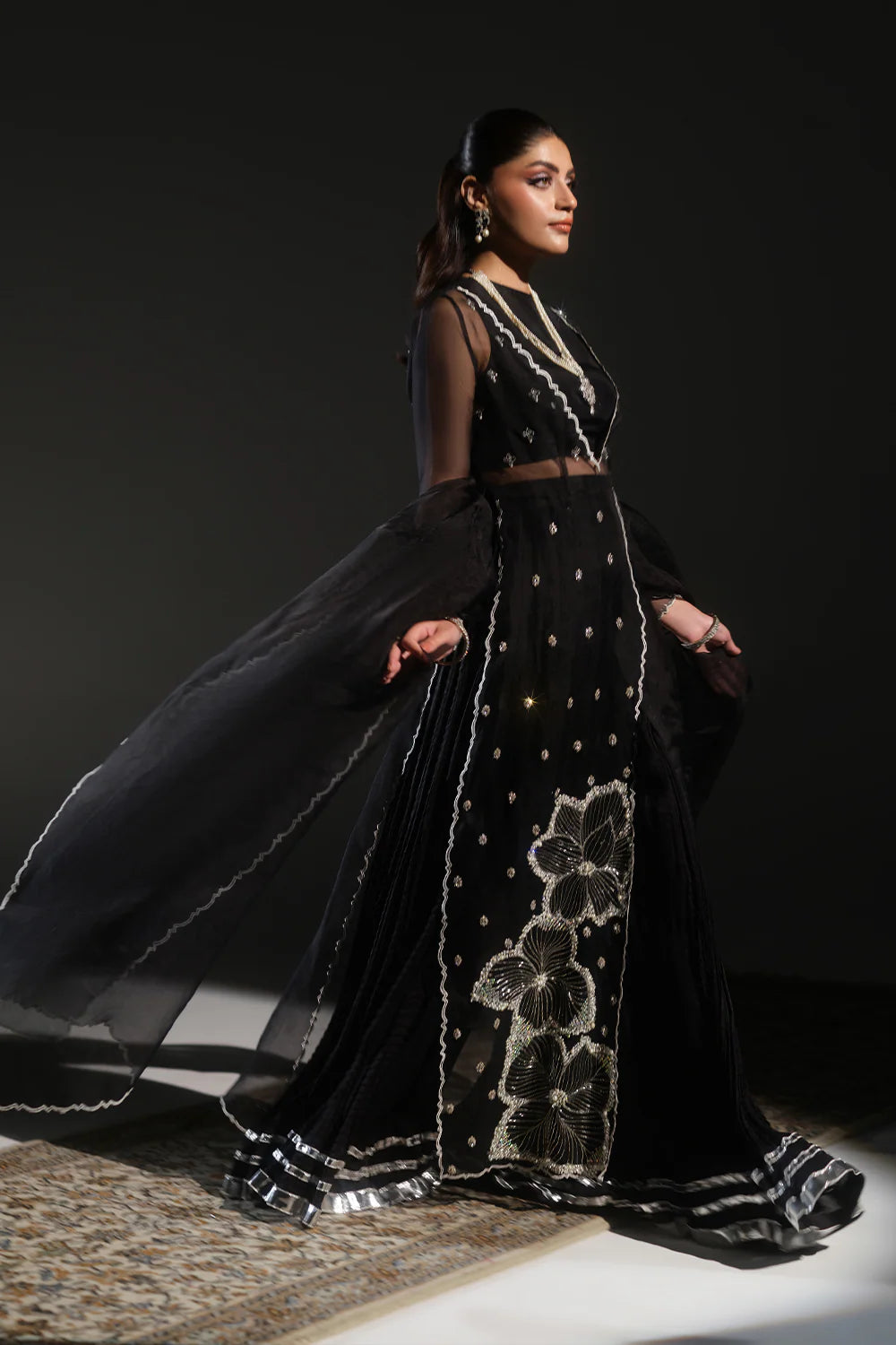 Paired with a crushed sharara in the same rich black hue, the ensemble offers a voluminous yet flattering silhouette that moves beautifully with every step. The combination of rich textures and dazzling embellishments makes this outfit the perfect choice for weddings, festive occasions, and formal evenings.