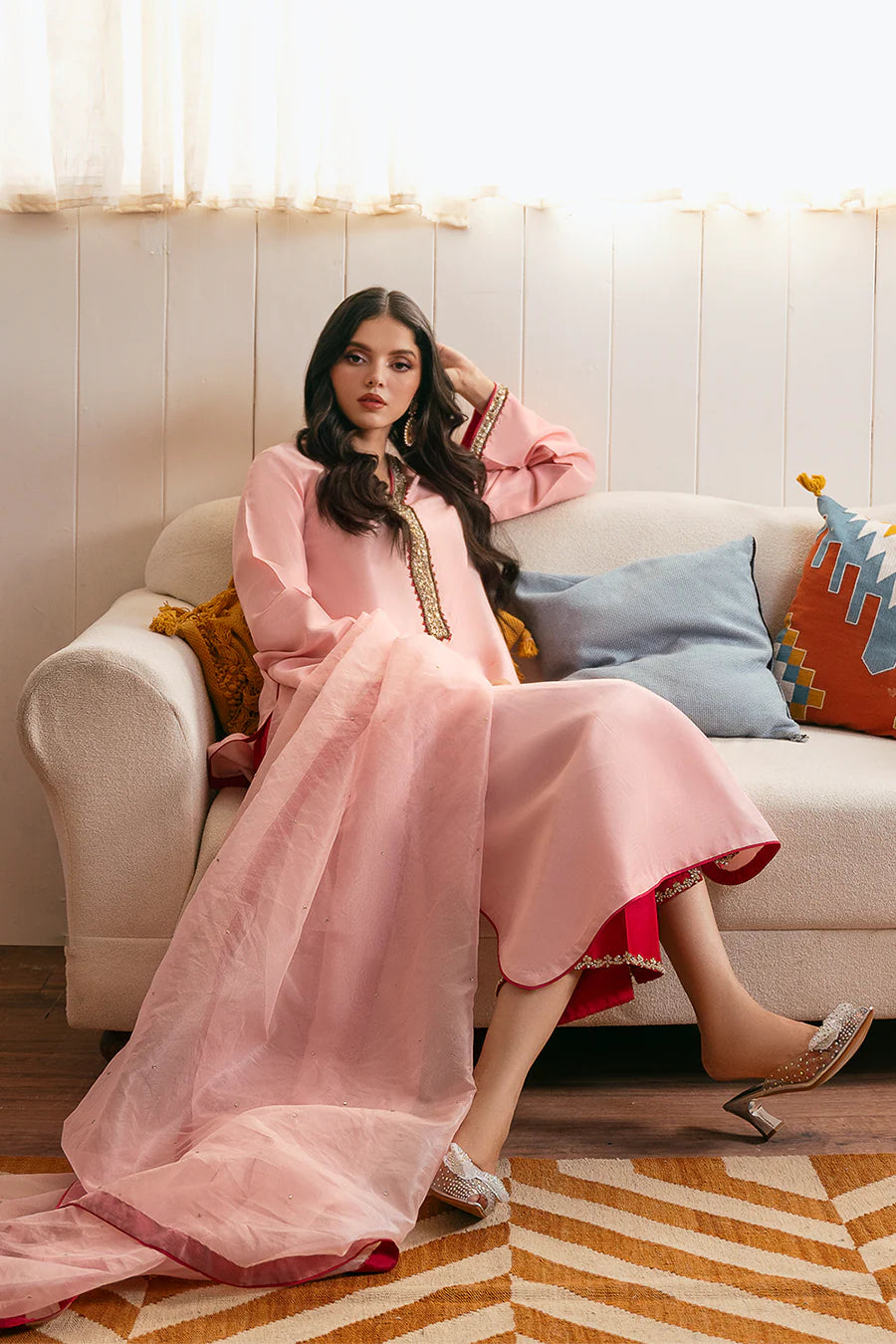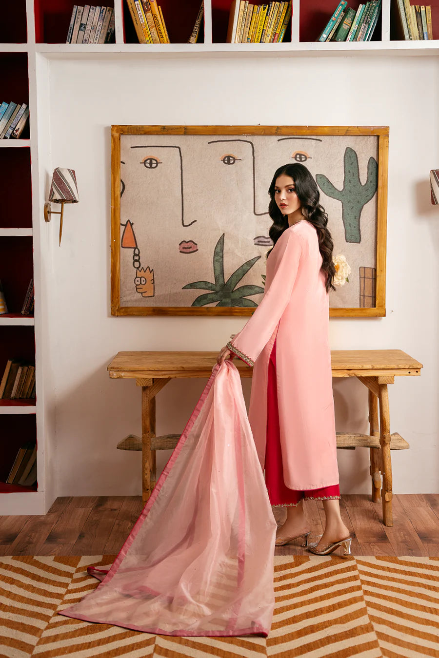 Fall in love with this enchanting combination of rose pink and light pink, designed to turn heads at every occasion. The short shirt features a hand-embellished neckline adorned with glimmering stones, Resham, sequins, and intricate naqshi detailing—an exquisite display of craftsmanship. Paired with rose pink culottes, also delicately hand-embellished, this outfit is the perfect blend of feminine charm and festive elegance.