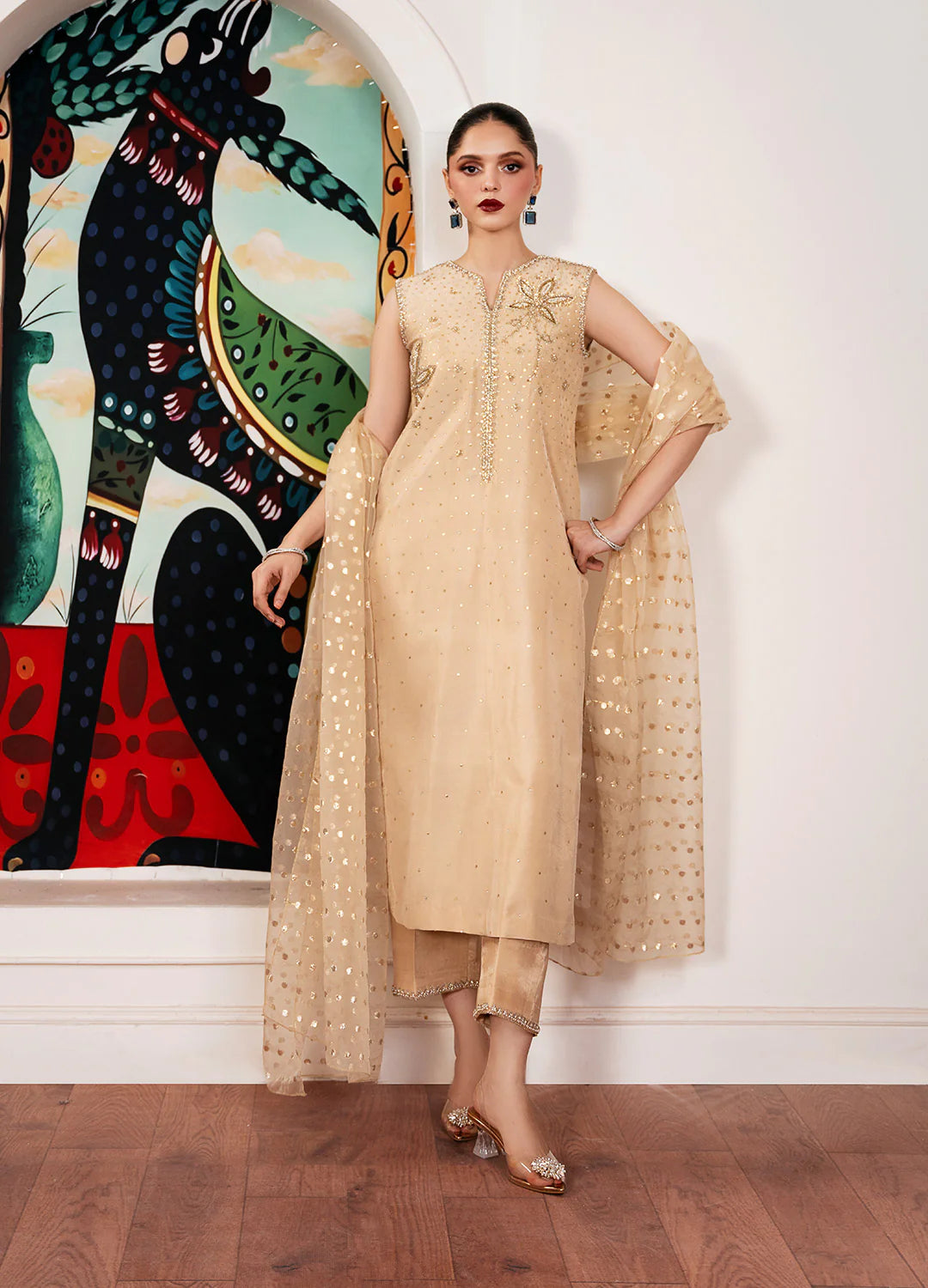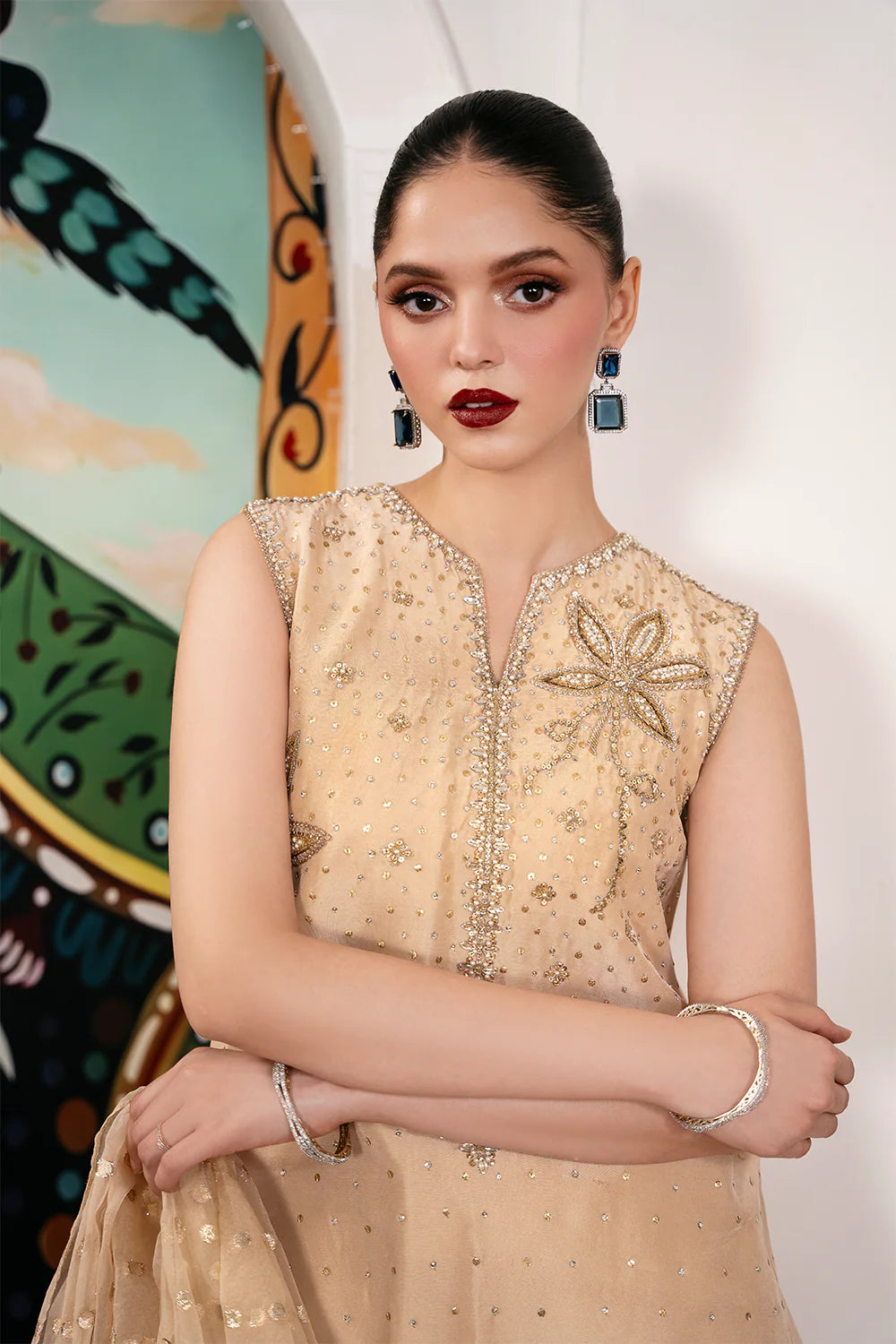 Elevate your style with this exquisite beige long shirt, meticulously adorned with delicate floral hand embellishments featuring swarovski crystals, sequins, and stones. The intricate craftsmanship adds a touch of understated glamour to the soft, graceful hue. It is paired with matching straight trousers and a sheer organza dupatta accented with subtle spray embellishments, completing the look with timeless elegance. Perfect for festive occasions or intimate gatherings.