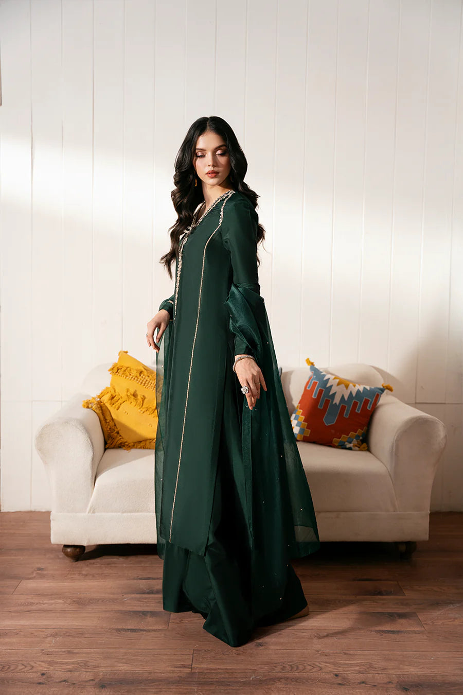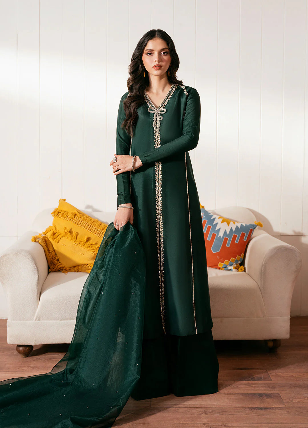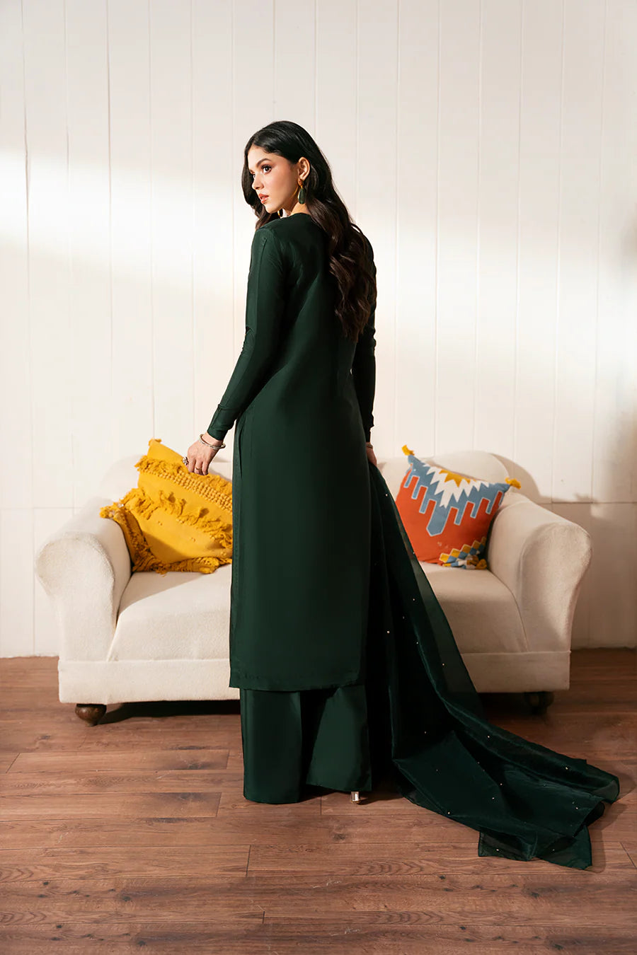 Elevate your festive wardrobe with this luxurious bottle green long shirt, featuring a unique and graceful bow-tie design that cascades elegantly down to the hem. Meticulously hand-embellished with sparkling stones, Swarovski crystals, and delicate pearls, this outfit exudes refined glamour. It is paired with matching long culottes and a sheer organza dupatta, completing the look with timeless sophistication—perfect for weddings, formal events, or special celebrations.