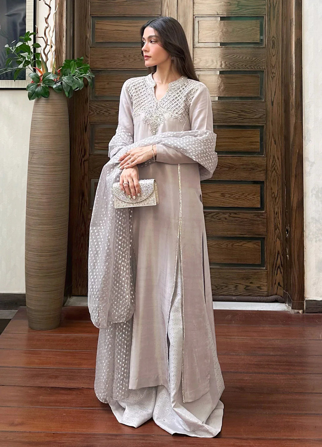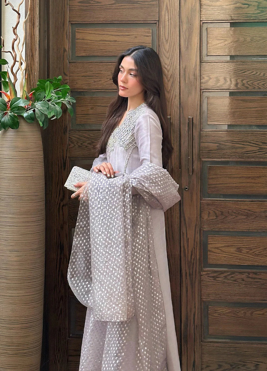 Chic and contemporary, this steel grey long gown-style shirt is a perfect blend of elegance and modern design. The neckline features exquisite cutwork that adds a refined, fashion-forward touch. Paired with matching trousers and a delicate organza dupatta, this ensemble offers effortless sophistication—ideal for formal events, evening soirées, or festive celebrations.