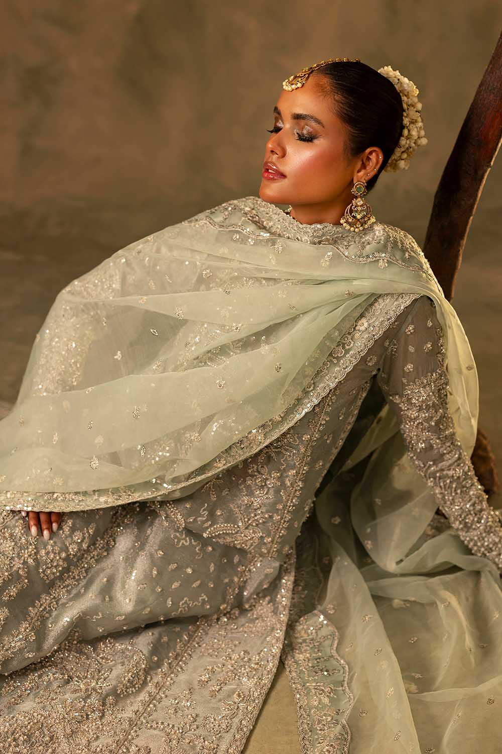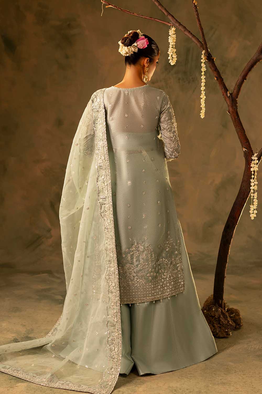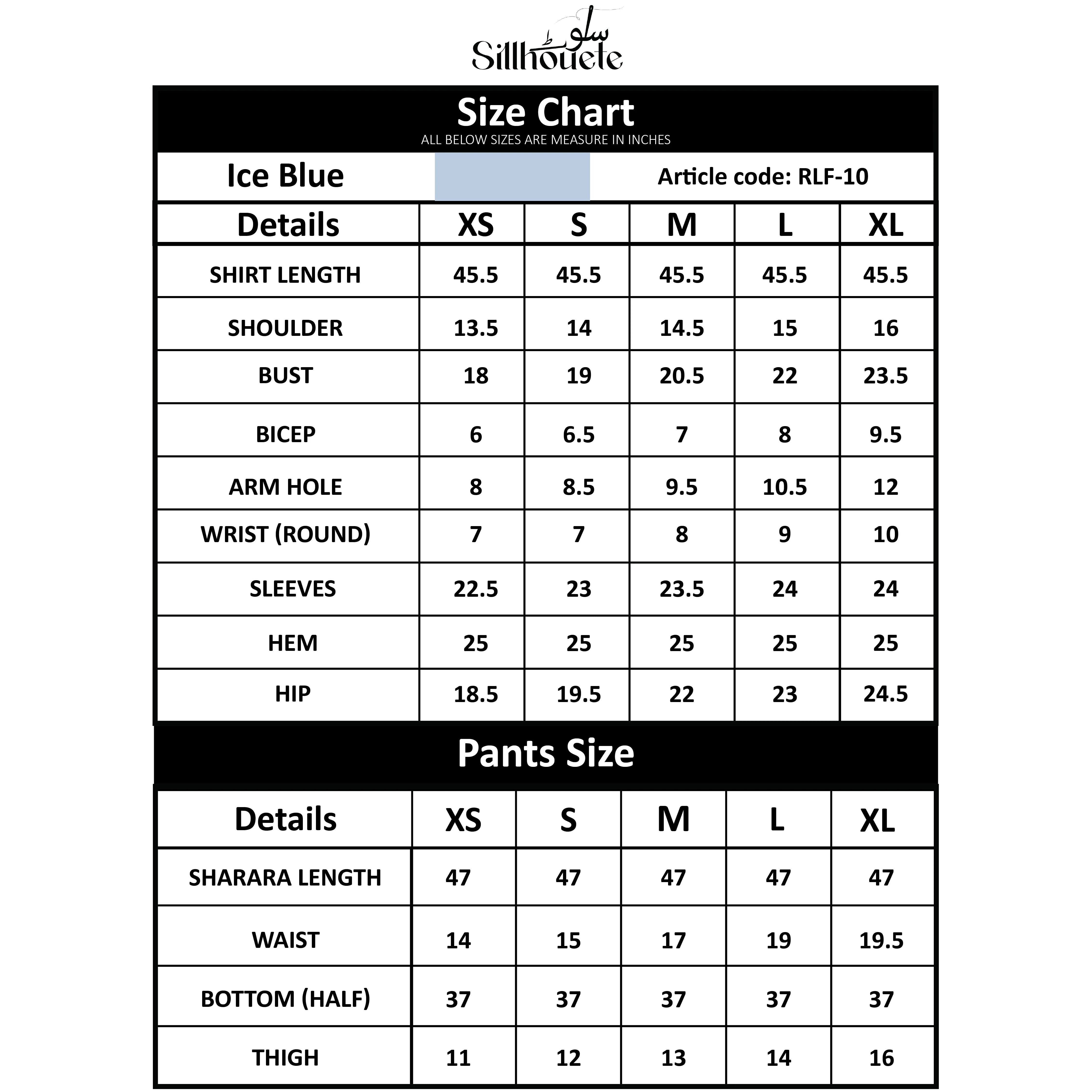 Meera is an enchanting ice blue ensemble crafted on luxurious tissue fabric, paired with an inner bustier for a structured and elegant fit. The long shirt is meticulously hand-embellished with pearls, Crystals, Swarovski, Naqshi, and Dabka, creating a radiant masterpiece of fine craftsmanship. It is paired with a flowing tissue Sharara, adding volume and a regal flair to the silhouette. A delicately worked dupatta completes the look, enhancing its ethereal elegance. Perfect for weddings, engagements, or festive soirées, Meera embodies timeless sophistication with modern charm.
