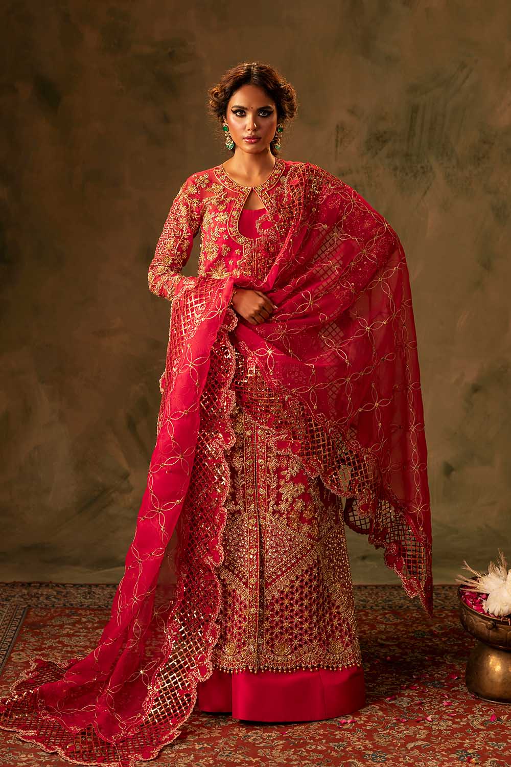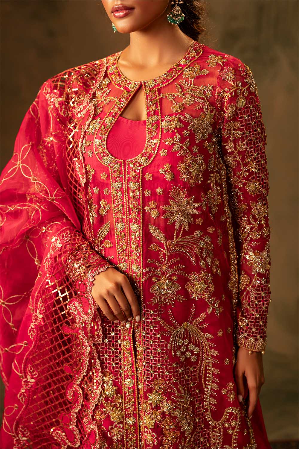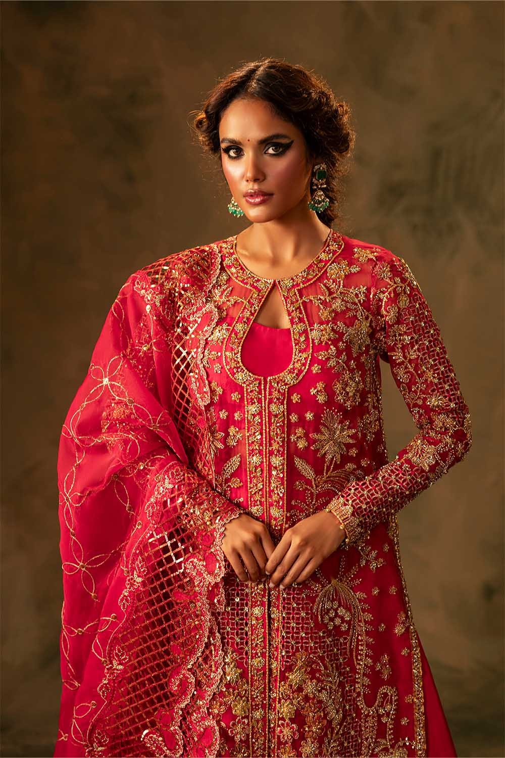 Experience the magic of an unforgettable entrance with 'Meher,' an exquisite, fuchsia-colored ensemble designed for grand celebrations. This radiant outfit perfectly balances ethereal drape with royal structure: the long shirt is made from sheer, lightweight Organza with bustier that catches the light, while the flowing, voluminous Sharara is crafted from rich Korean Raw Silk, ensuring a flattering fit and luxurious texture. The entire piece is a testament to heirloom craftsmanship, dazzling with a generous spread of brilliant Sequins and radiant Crystals, complemented by the regal, three-dimensional texture of traditional Naqshi work. The exquisite design is completed with classic golden embellishments, featuring intricate Gota and delicate Kingri (scalloped border) detailing that frames the look in enduring elegance.