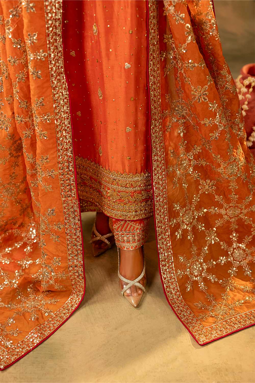 Step into timeless sophistication with Tabeer, a captivating ensemble crafted from luxurious raw silk in a rich Rust hue. This long, straight-cut shirt is a tribute to traditional artistry, featuring heavy embellishments on the neckline, sleeves, and border. Intricate handwork of Naqshi, Dabka, Mukesh, Crystals, Gota, and Sequins, adds radiant charm and depth to the design.