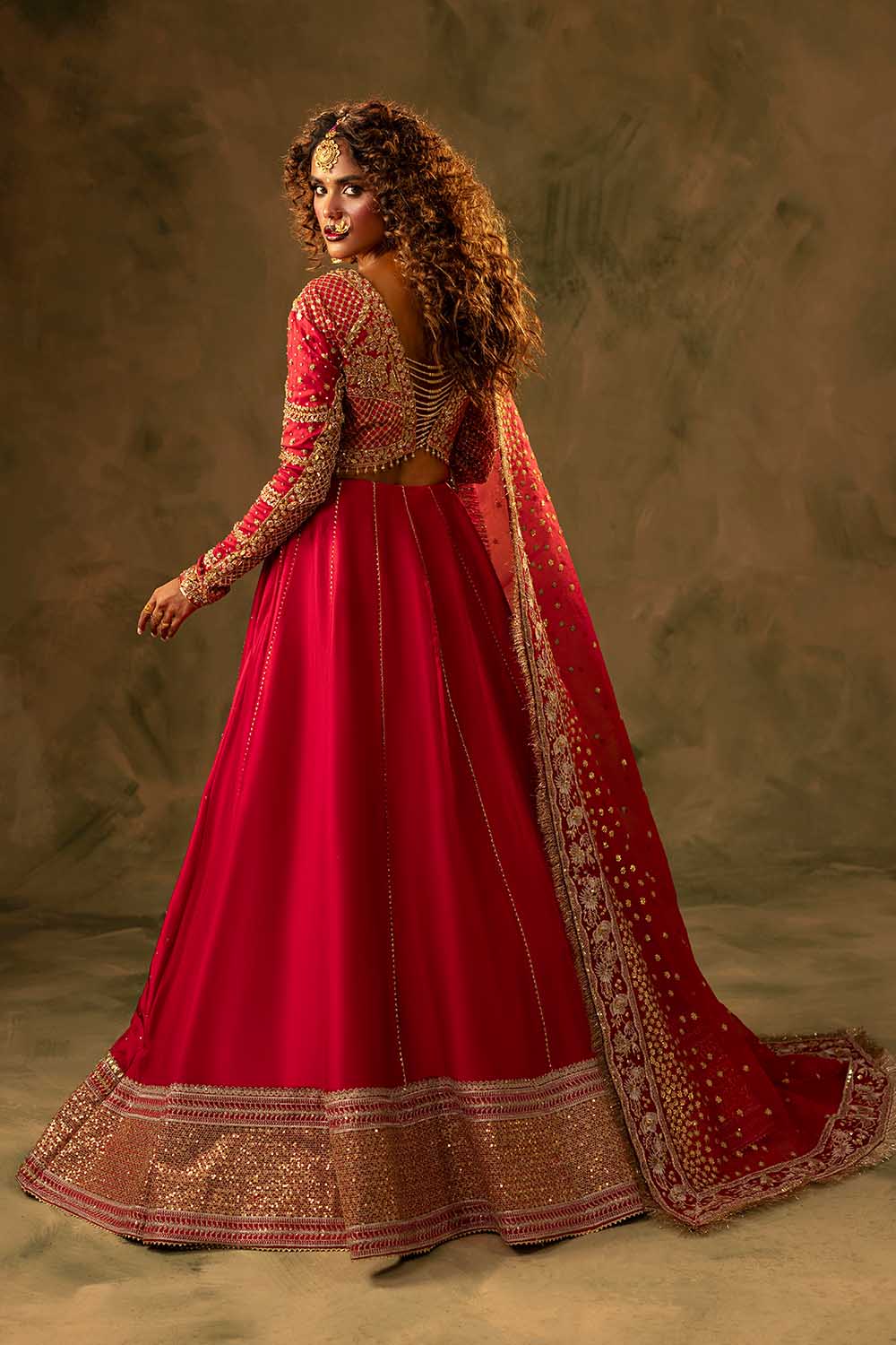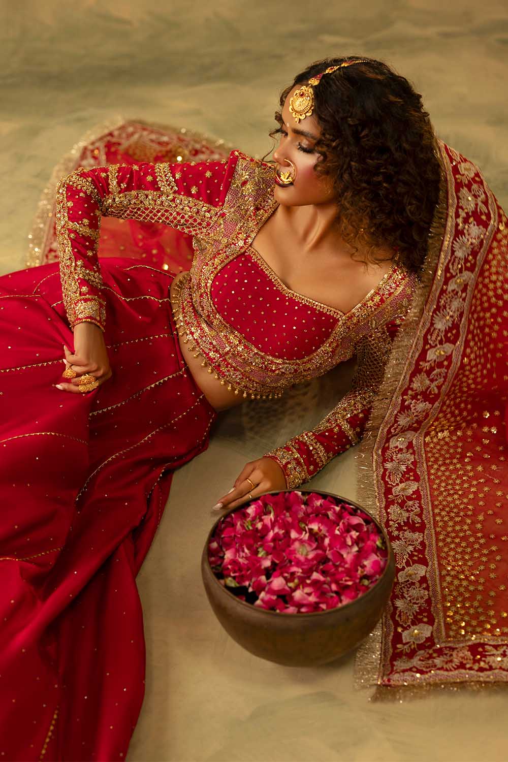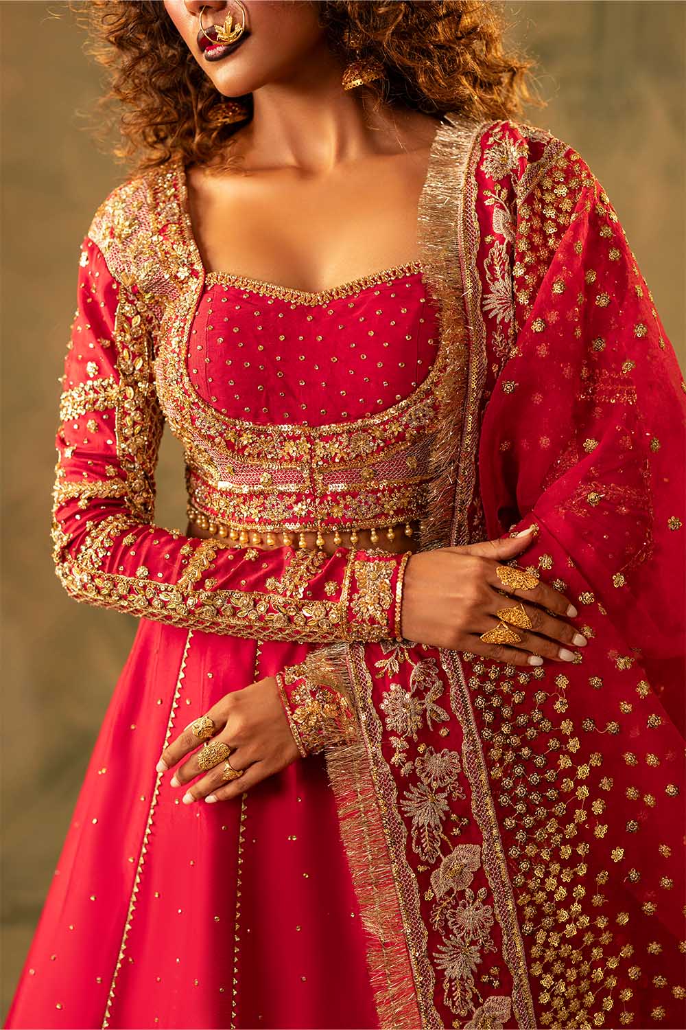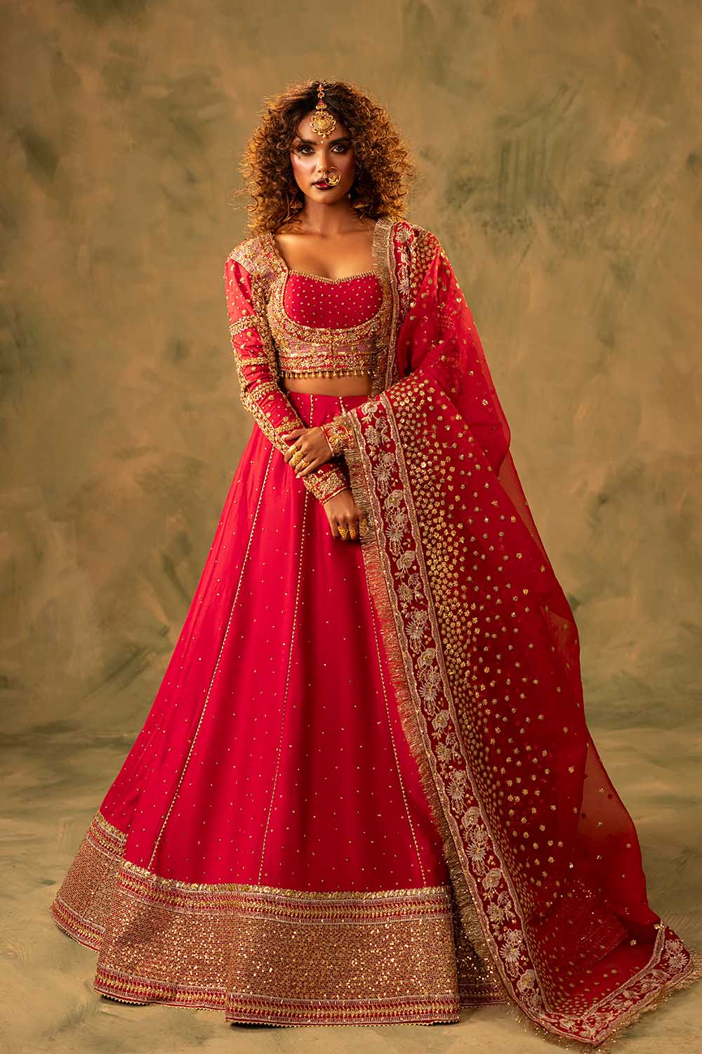 Zeenat is the epitome of heavy formal grandeur, designed in a striking red hue on rich tissue Korean raw silk, a fabric that radiates luxury with its delicate sheen and graceful fall. The lehnga and choli are adorned with masterful handwork, featuring Naqshi, Dabka, Gota, Crystals, Mukesh, and Sequins, creating a breathtaking play of texture and sparkle. The silhouette is regal yet modern, tailored to make you shine on your most special day. Completing the ensemble, the dupatta is lavishly embellished using a modern spray technique, balancing tradition with contemporary artistry. Perfect for mehndi, baraat, or any festive celebration, Zeenat is more than an outfit—it’s a statement of timeless elegance and royal sophistication