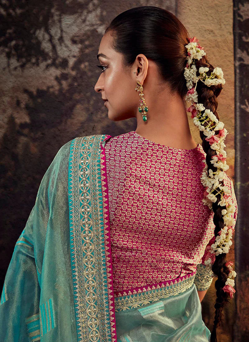 Sky Blue and Pink Embroidered Festive Saree