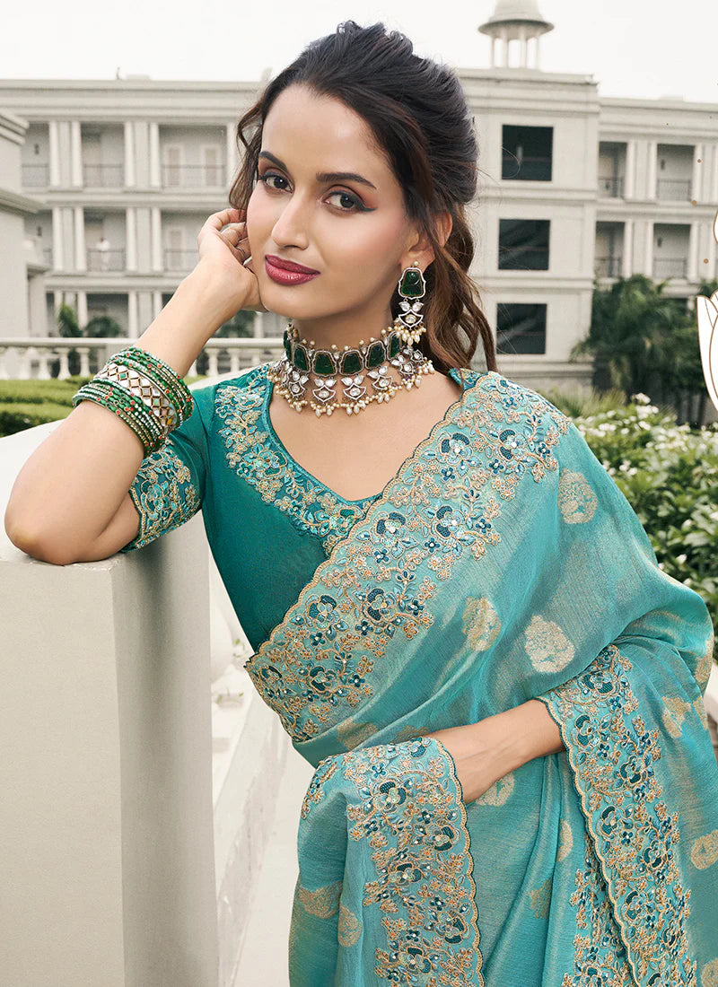 Sky Blue Embroidered Wedding Saree