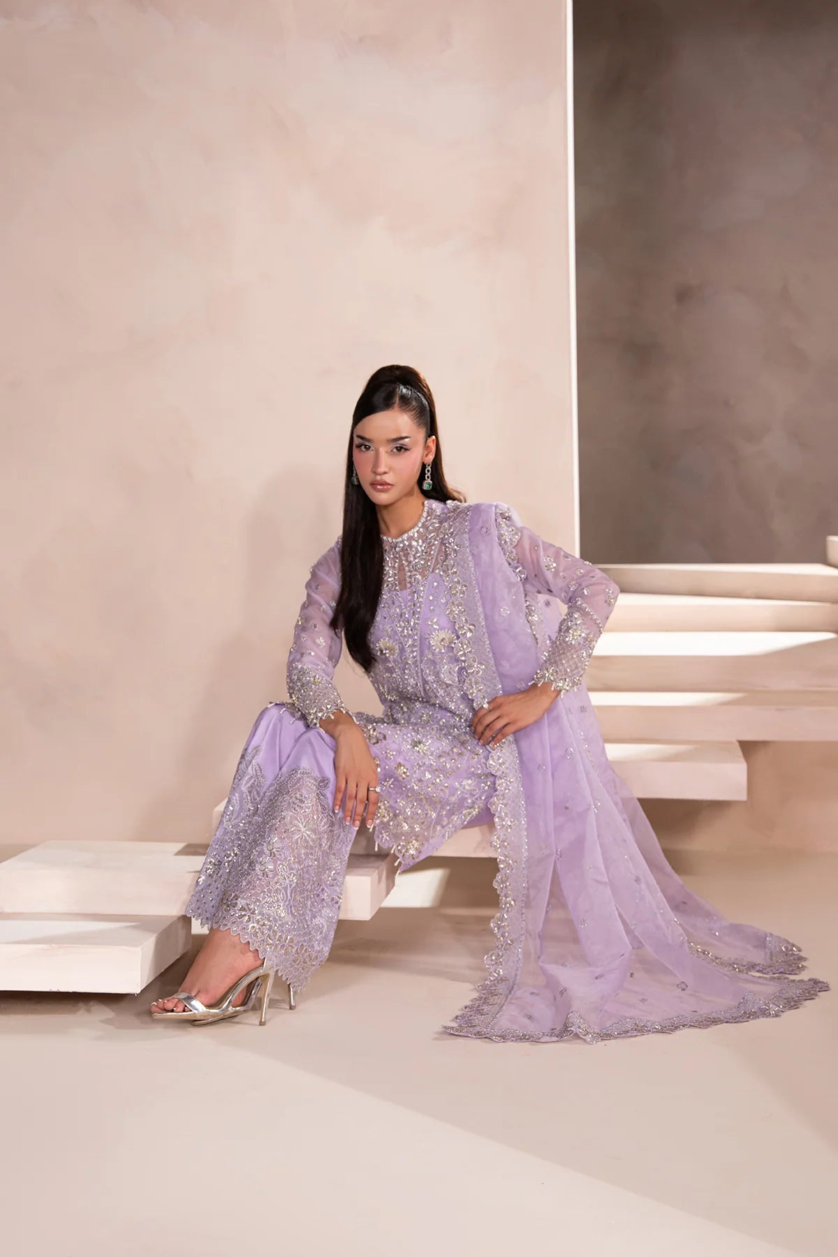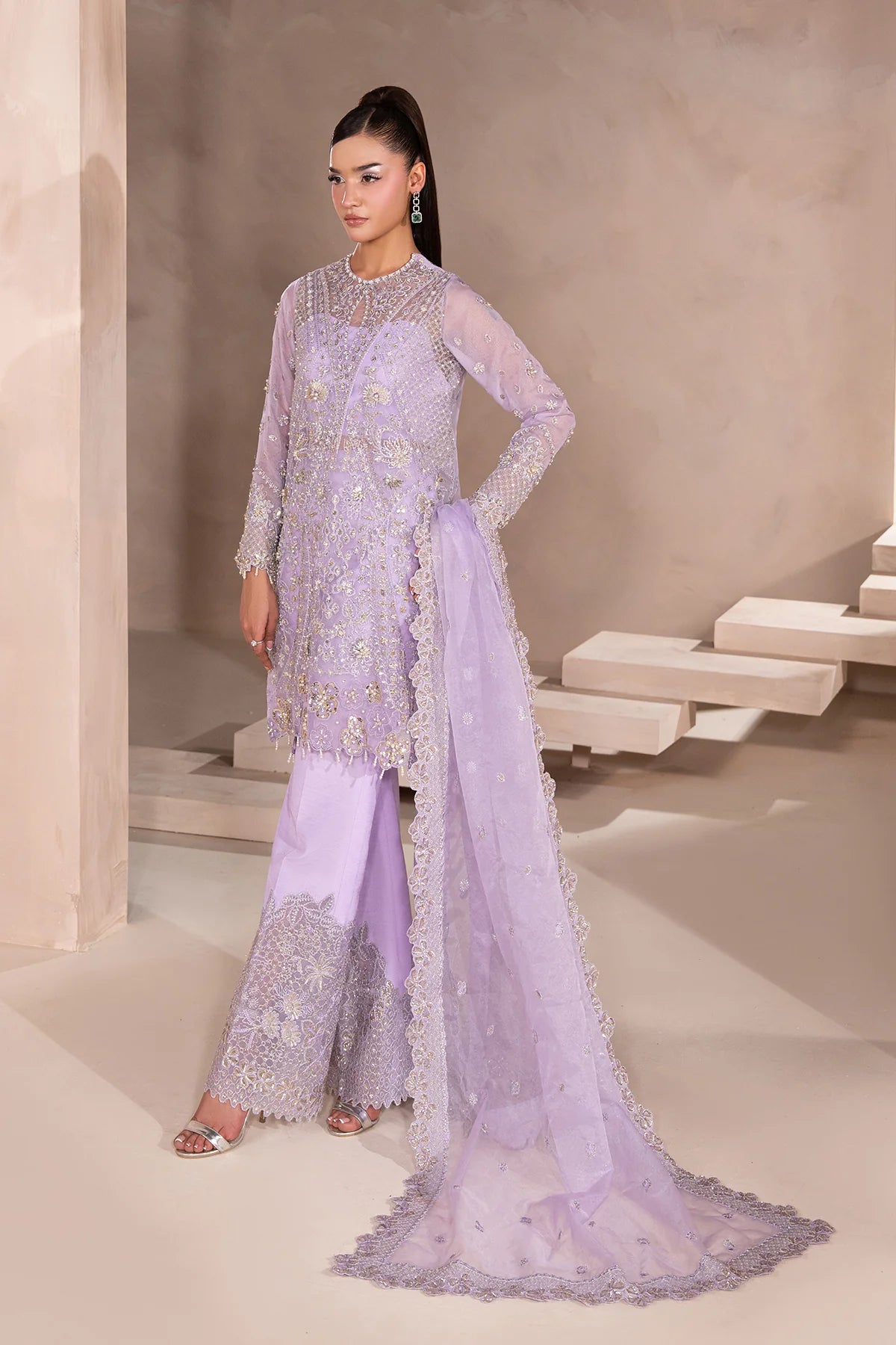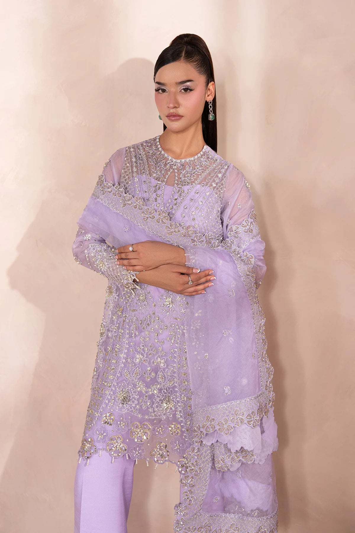 A Graceful Lavender outfit featuring a short organza shirt with a uniquely crafted, modern neckline, adorned with delicate silver embellishments that shimmer subtly. It’s paired with bootcut-style pants in a sleek silhouette, adding structure and contrast to the airy top. The look is finished with a matching organza dupatta, elegantly bordered and detailed with fine silver work, enhancing the soft, ethereal vibe.