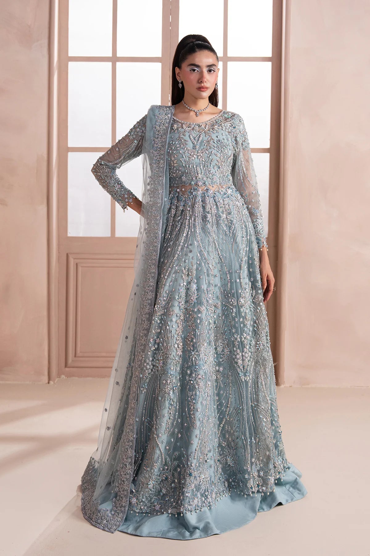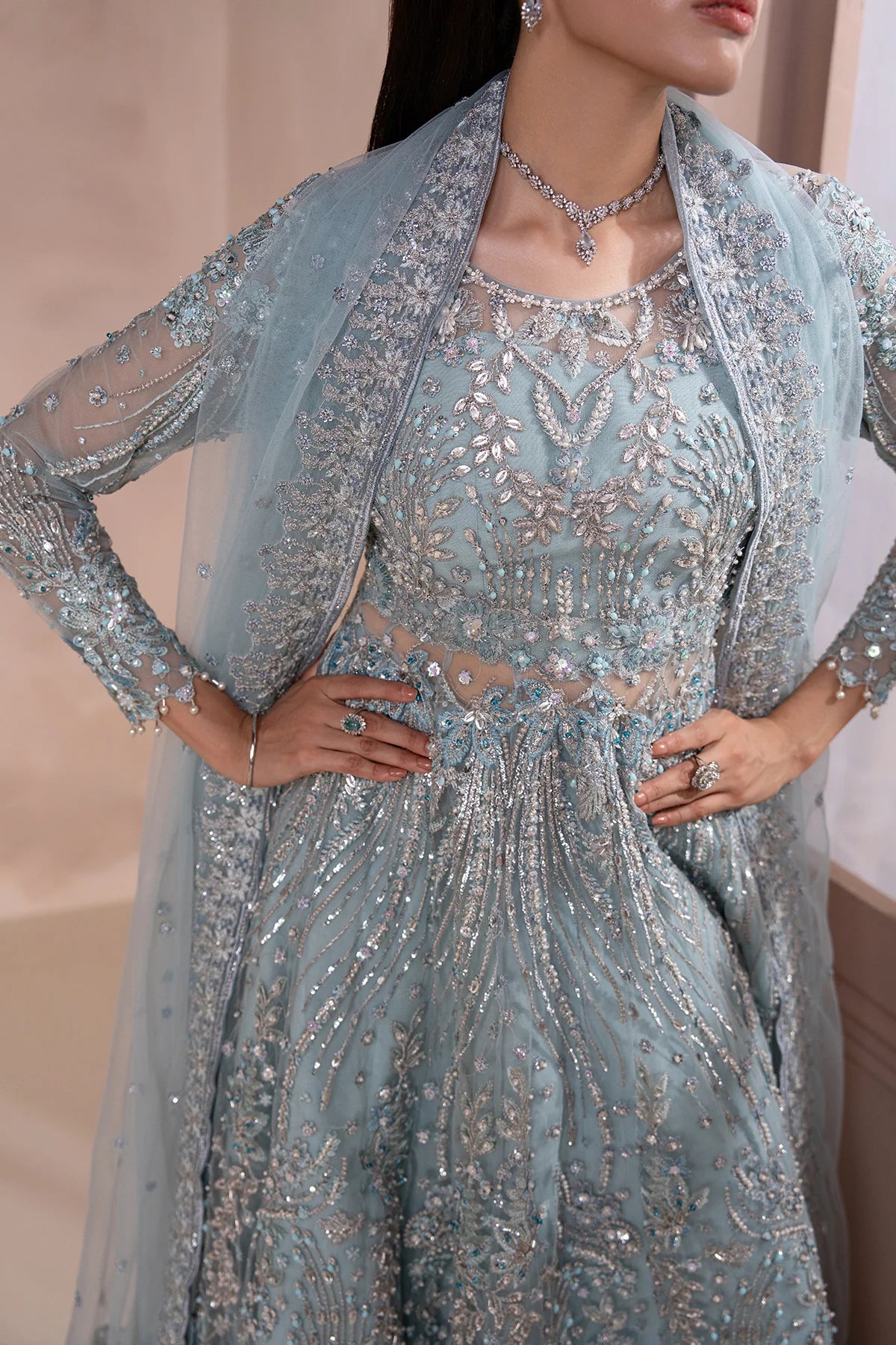 A Mesmerizing Ice Blue Net Pishwas featuring a graceful, floor-length silhouette layered over a long lehenga, creating a soft, regal flow. The entire outfit is adorned with modern, intricate embellishments and contemporary floral patterns, blending elegance with artistic detail. Paired with a matching net dupatta, delicately finished with embellished borders, the ensemble exudes ethereal charm and sophistication—perfect for a refined, fashion forward celebration.