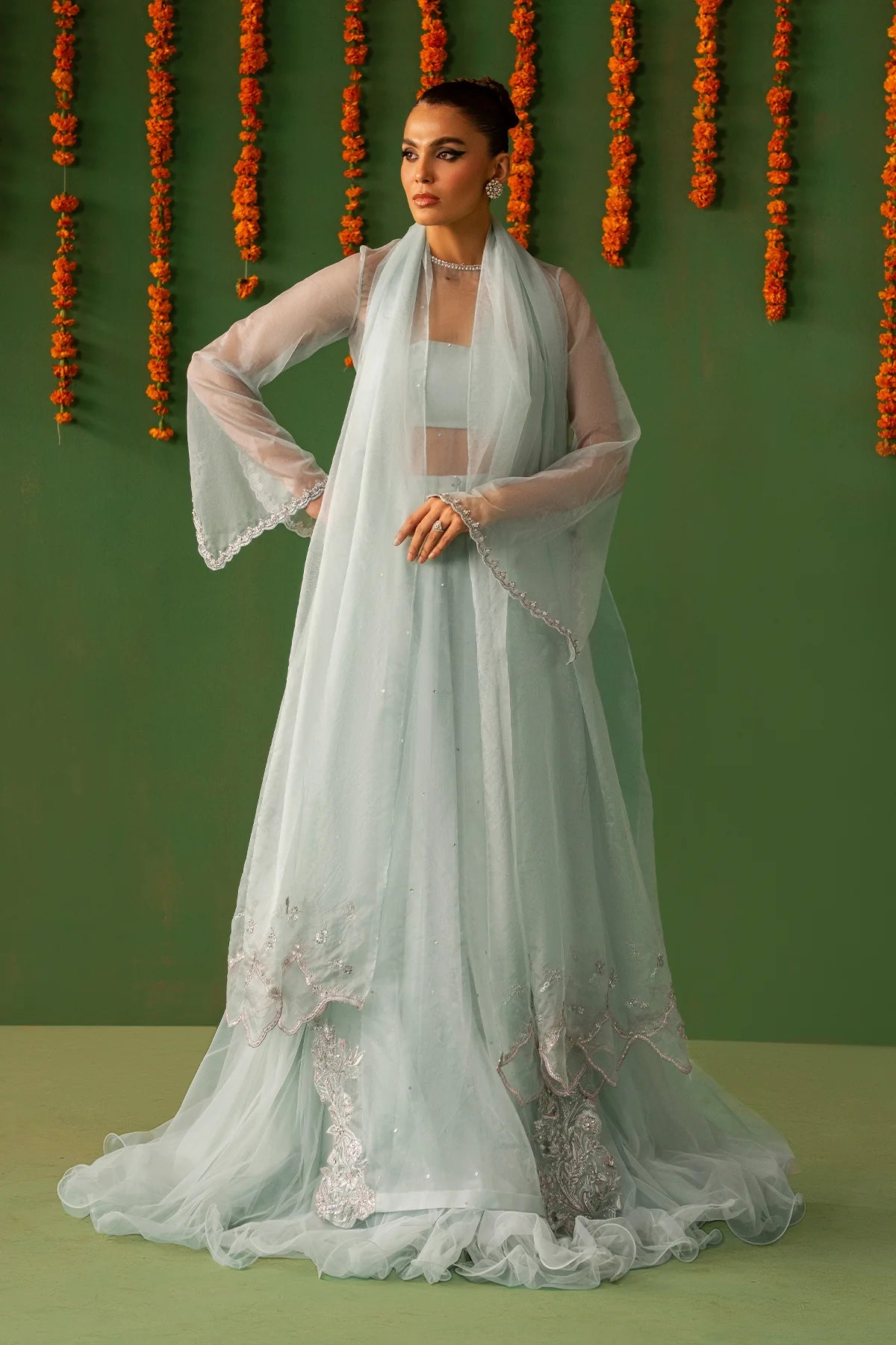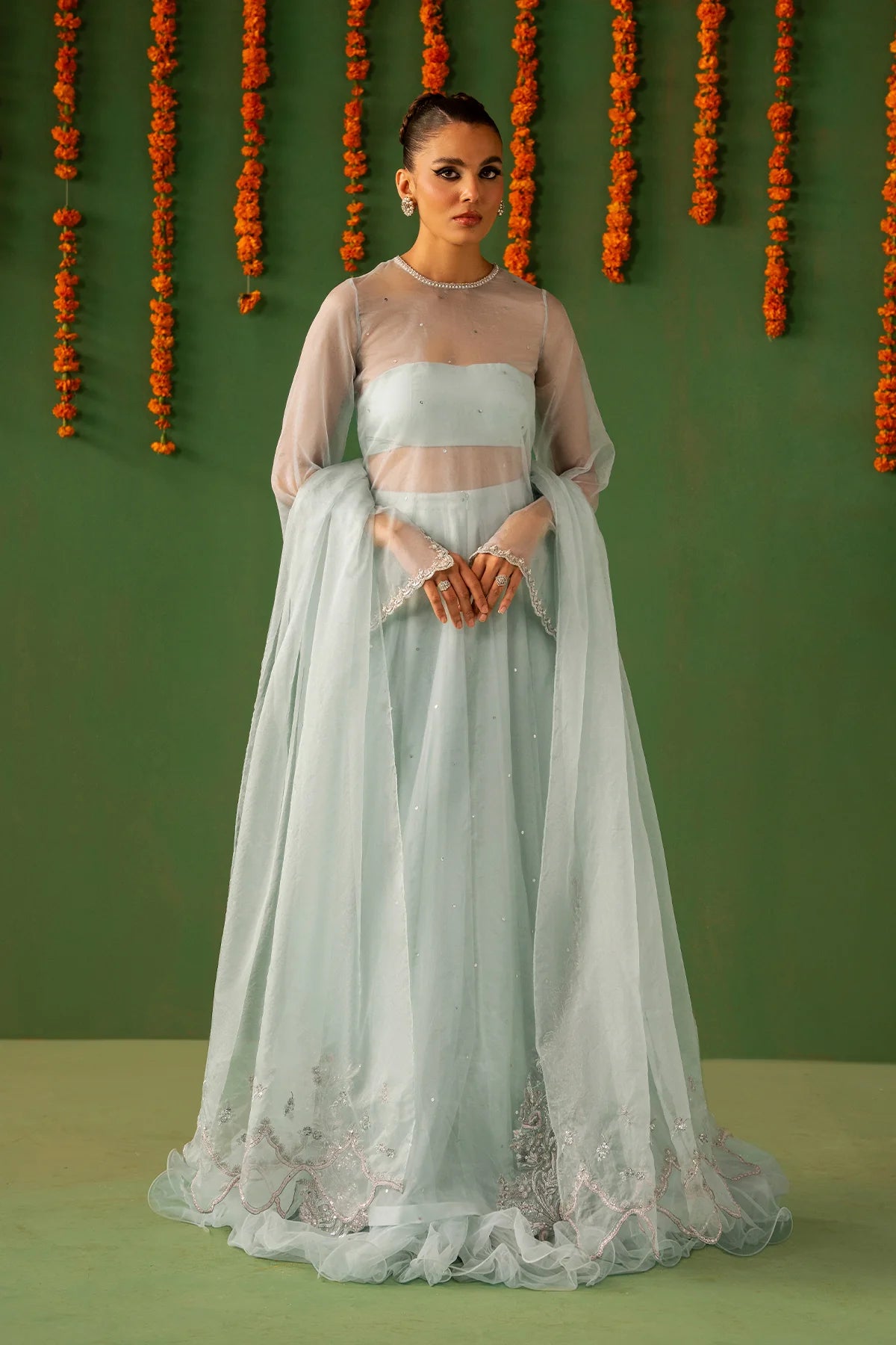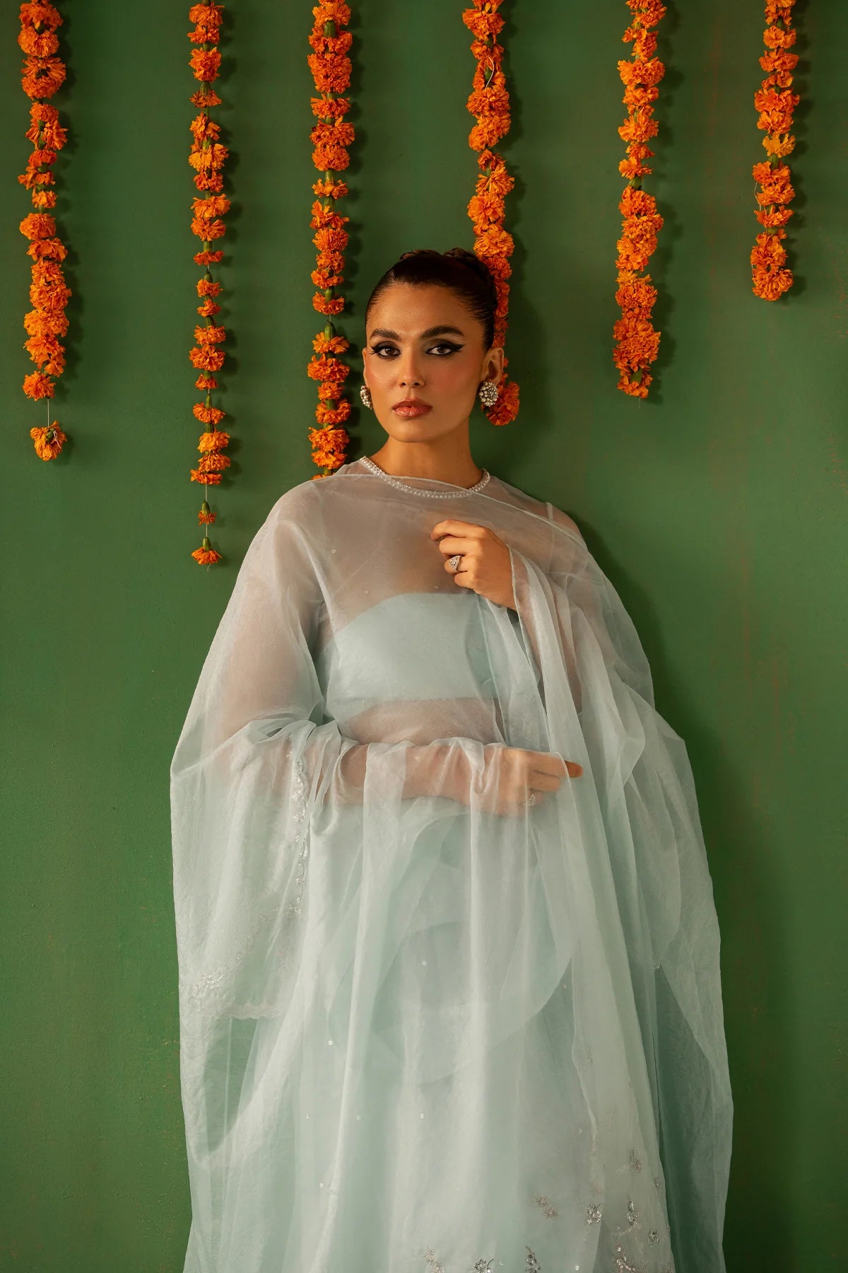 An enchanting ice blue ensemble featuring a full-length Organza shirt paired with a matching embroidered dupatta and flared Net pants. The shirt is beautifully detailed with intricate embroidery and delicate hand embellishments along the crew neckline, hems, and sleeves, enhanced with elegant slits. The dupatta, adorned with embroidery on both borders, completes the look with a touch of elegance.
