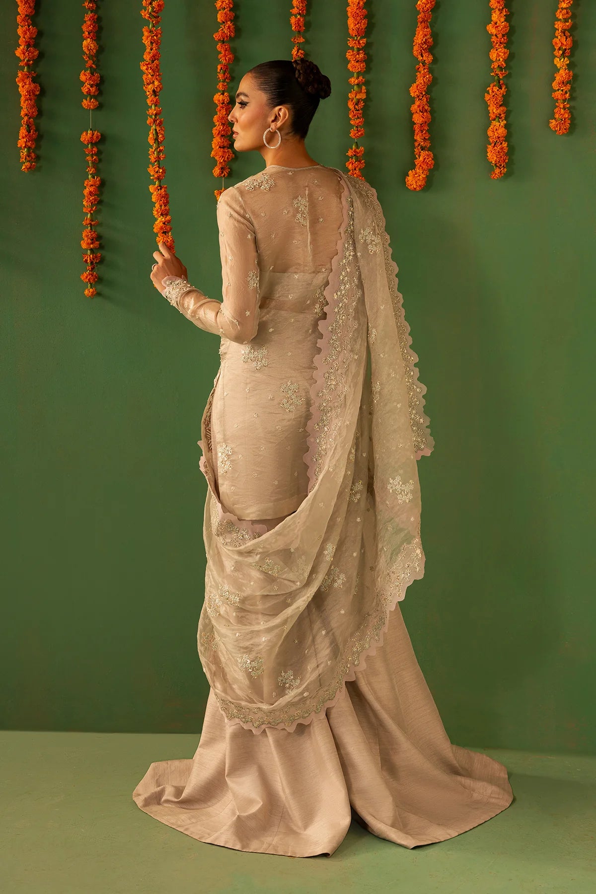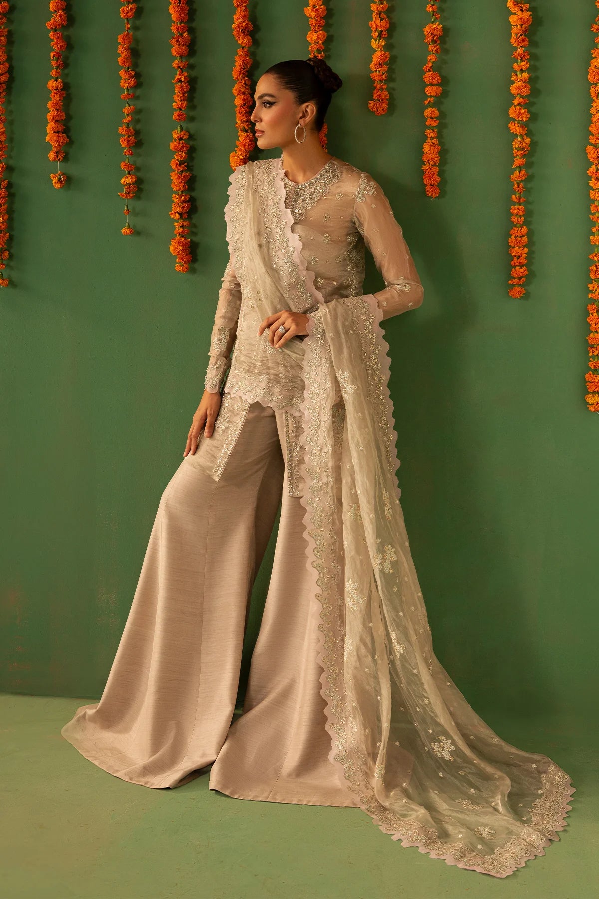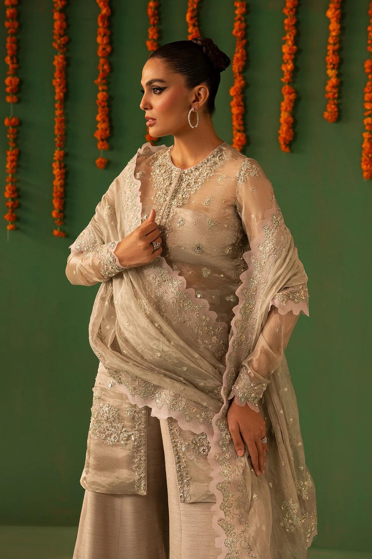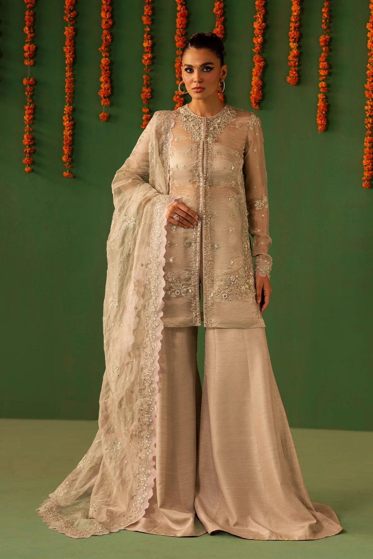 A rich champagne-colored short front-open gown in Organza, adorned with exquisite handwork of Swarovski crystals, pearls, cut dana, and sequins. The embroidery is elevated with delicate hand embellishments. Paired with Raw Silk flared pants in a simple yet sophisticated cut and complemented by an Organza dupatta detailed along all four borders, this outfit simply showcasing an effortless charm and charisma.