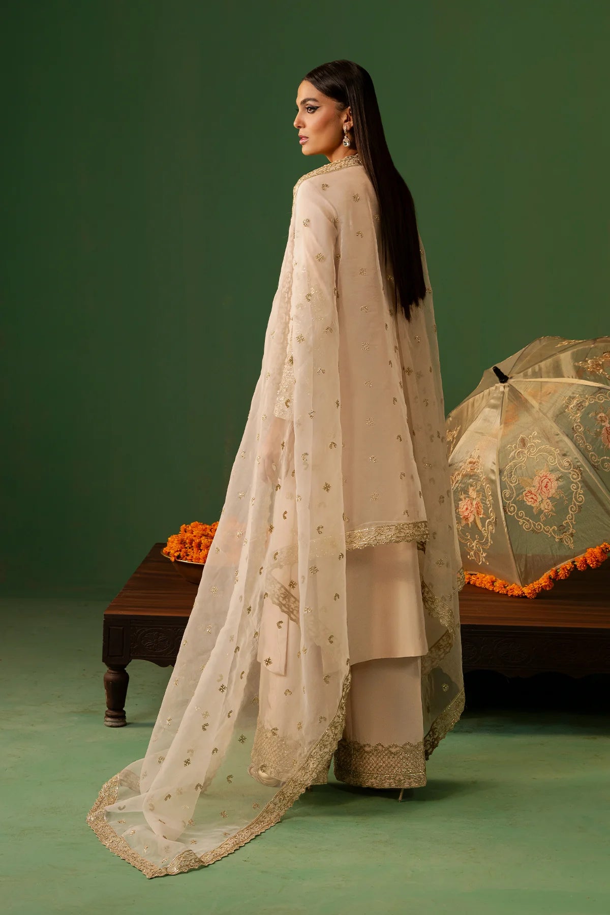 Leena is timeless beige outfit having a full-length shirt adorned with detailing of Swarovski crystals, pearls, cut dana, sequins, and gota lace. The design highlights a heavily embellished neckline and cuffs. In Tassar Silk fabric, paired with azar pants featuring delicate embellishments along the rounded hem. Completing the look is a beautifully crafted organza dupatta, intricately detailed all over, adding a touch of pure grace.