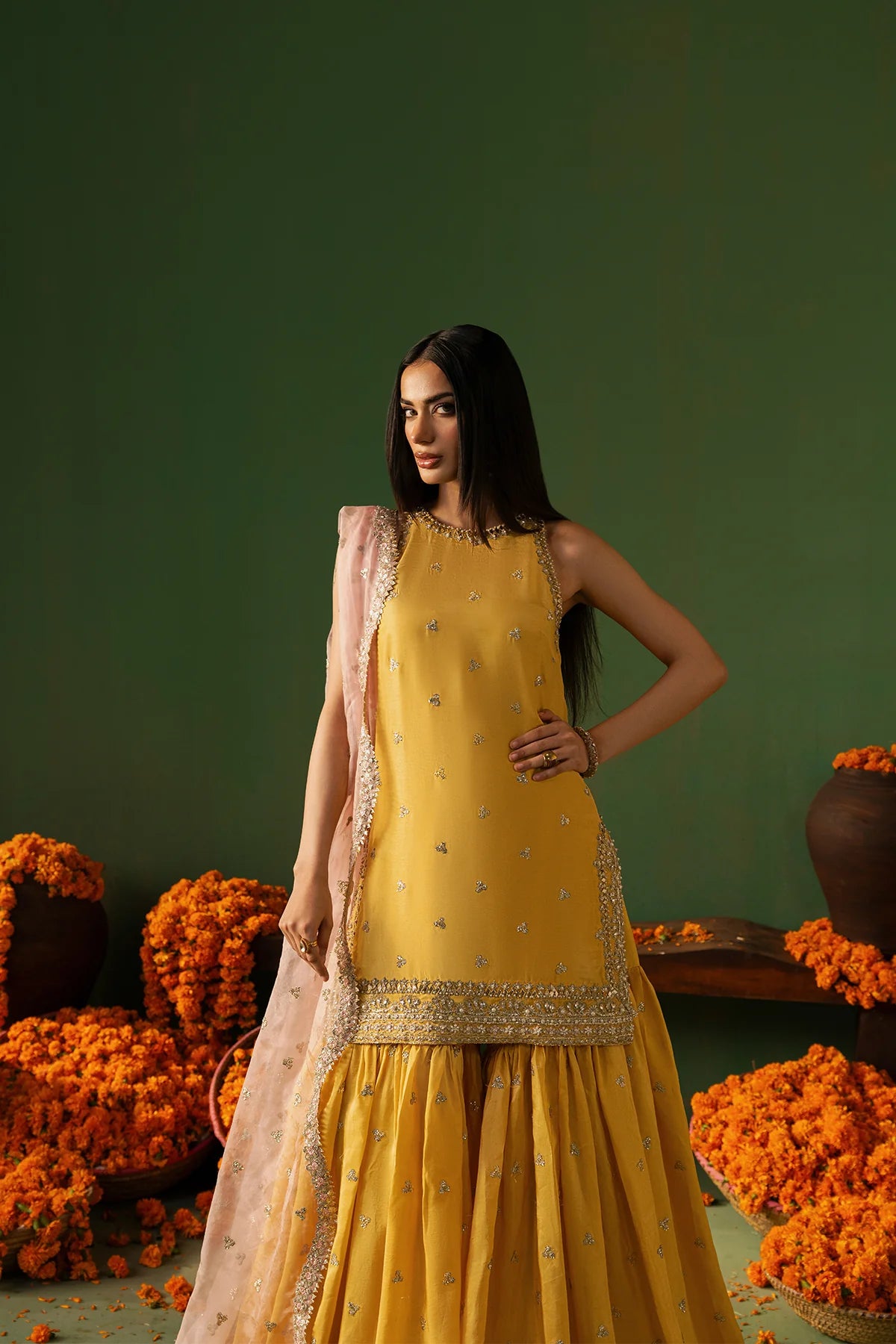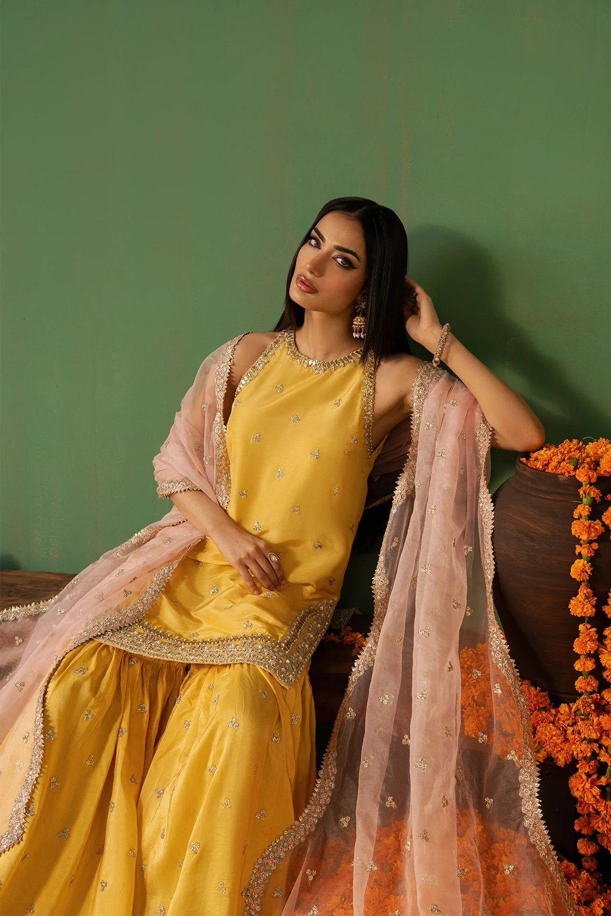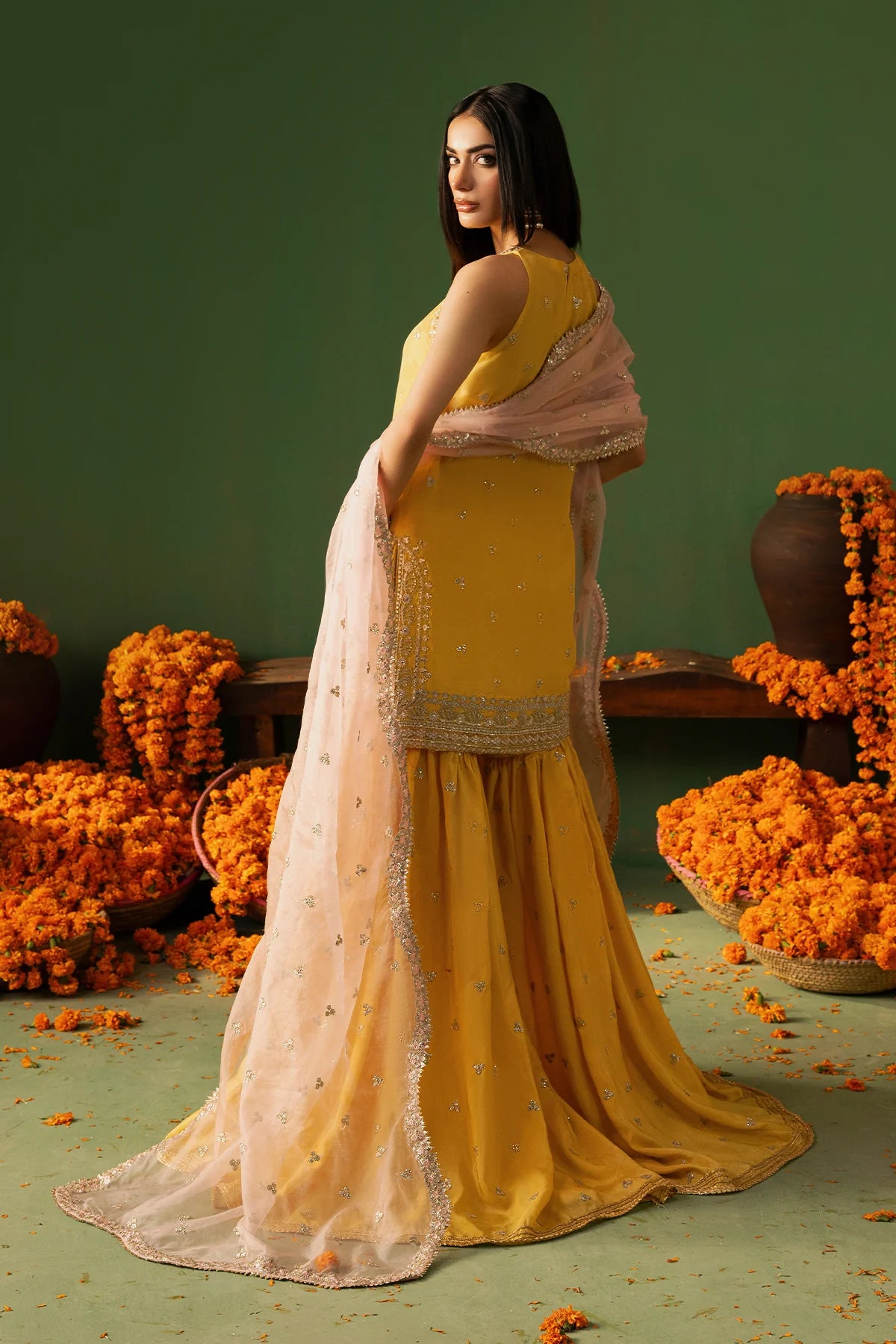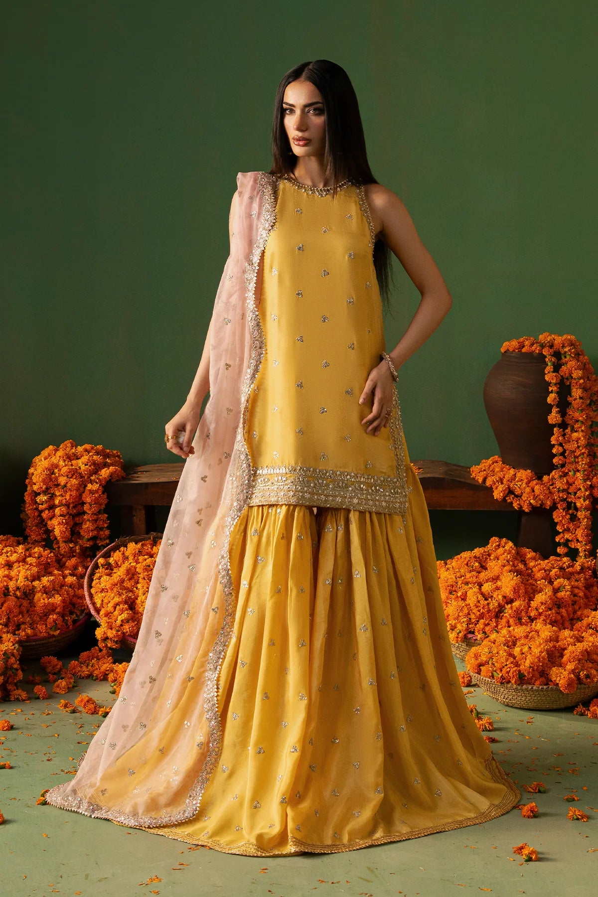 In refreshing mustard color, Mahay featuring a short Tassar Silk shirt paired with classic gharara pants. The shirt is uplifted with exquisite detailing of pearls, Swarovski crystals, cut dana, gota laces, and delicate goti work, beautifully accentuating the neckline. Paired with a contrasting subtle pink Organza dupatta enriched with matching embellishments, this look radiates festive charm.