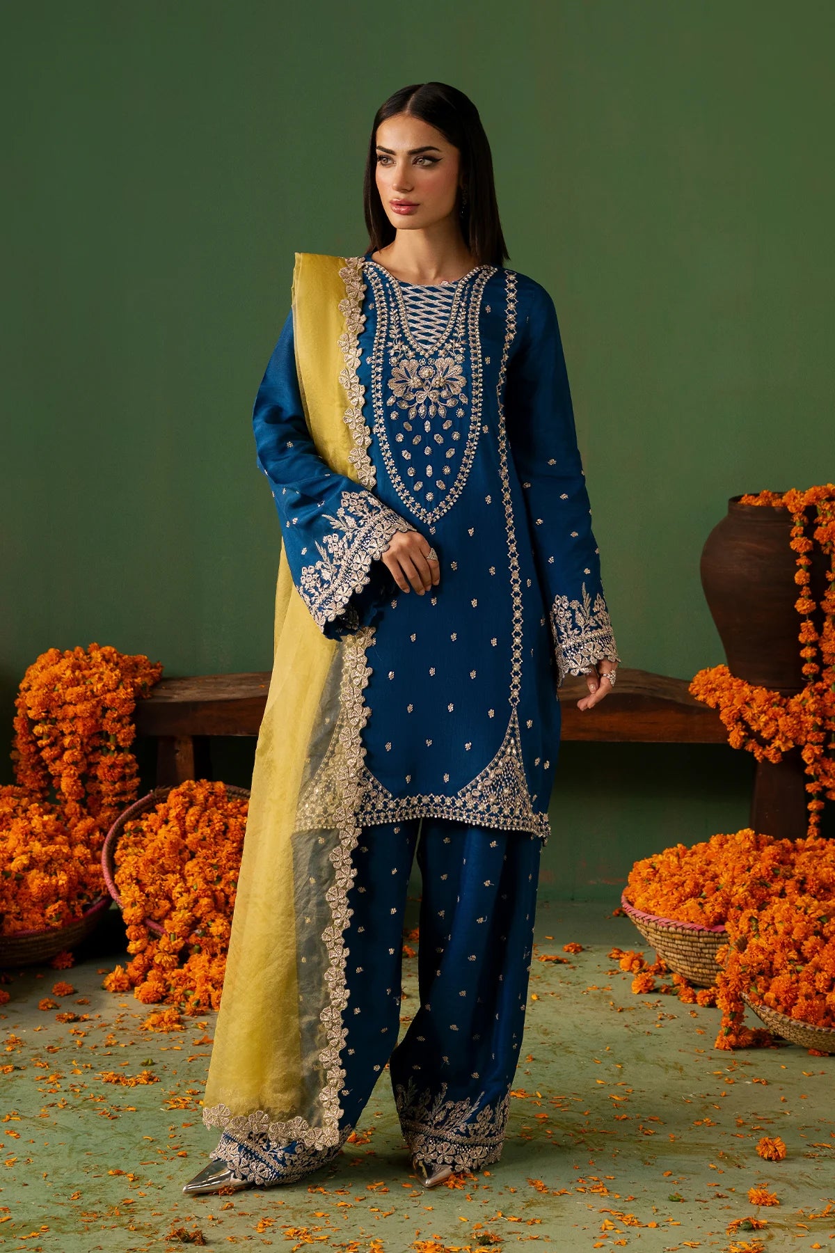 Raynah is an eye-catching cobalt blue outfit featuring a short Tassar Silk shirt paired with a trendy shalwar, with detailing of sequins, Swarovski crystals, cut dana, and gota work. The sleeves, borders, and neckline are beautifully enhanced with intricate embroidery and delicate hand embellishments. Completing the look is a contrasting yellow Organza dupatta, finished with finely detailed borders that perfectly complement the vibrant and contemporary grace of the outfit.