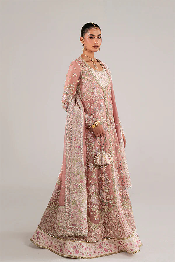 - A rose coral printed crushed slub pishwas under an organza front‑open jacket, heavily hand‑embroidered in silver & gold, with tassel detailing at the front; sleeves fitted, full length, hem tassels.