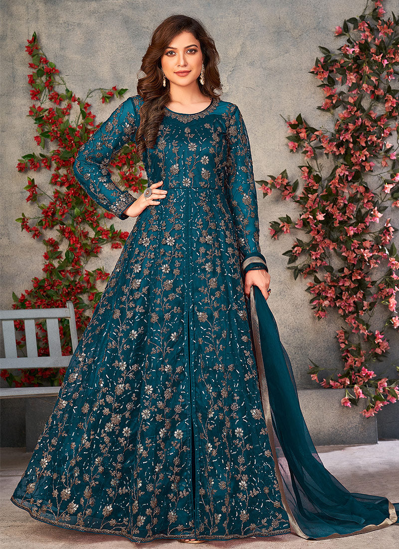 Teal and Gold Embroidered Anarkali features a net top with embroidery. Comes with satin inner and bottom with net dupatta.
