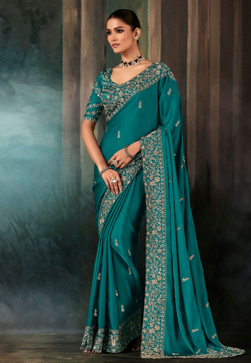 Teal Embroidered Festive Saree