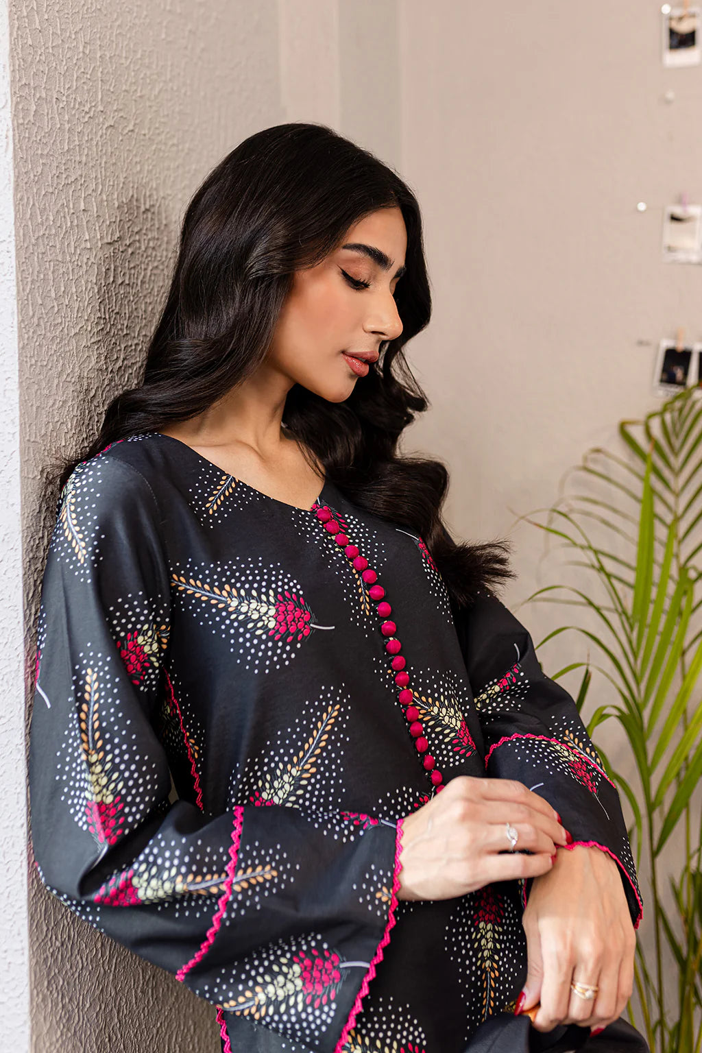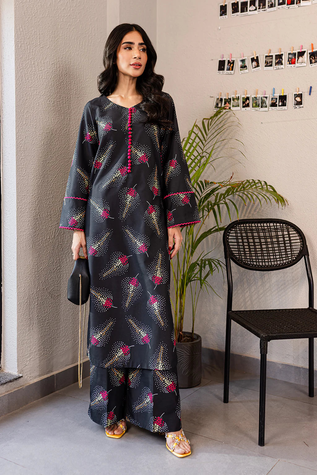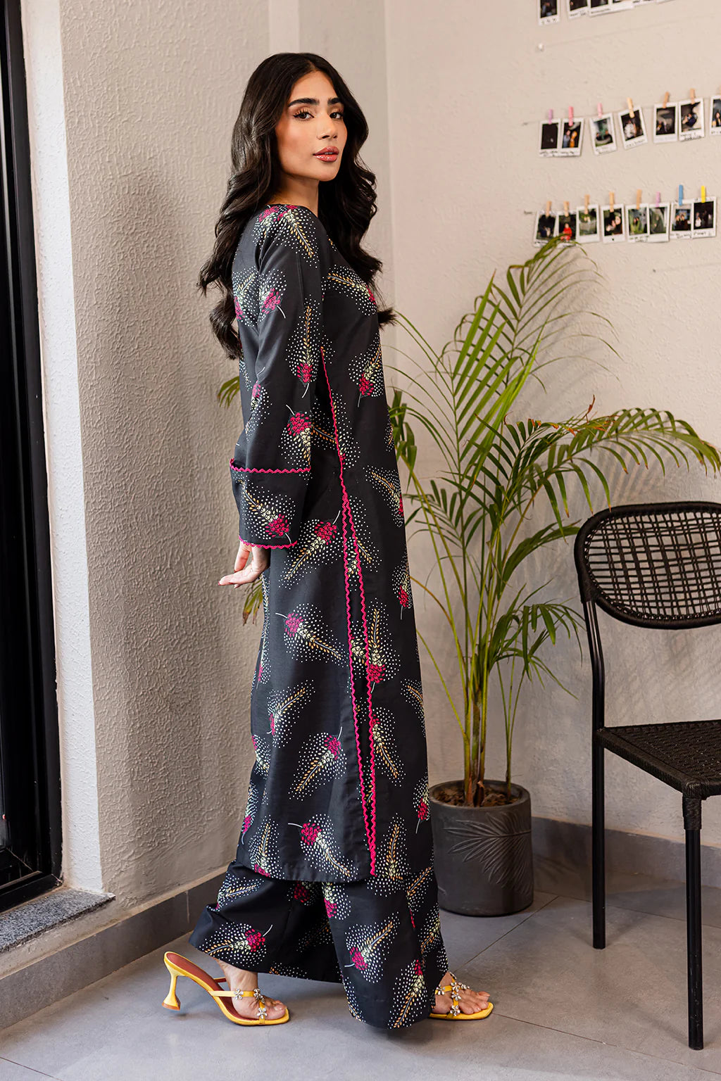 Black with hot pink floral pattern long length shirt, paired with wide legged pants