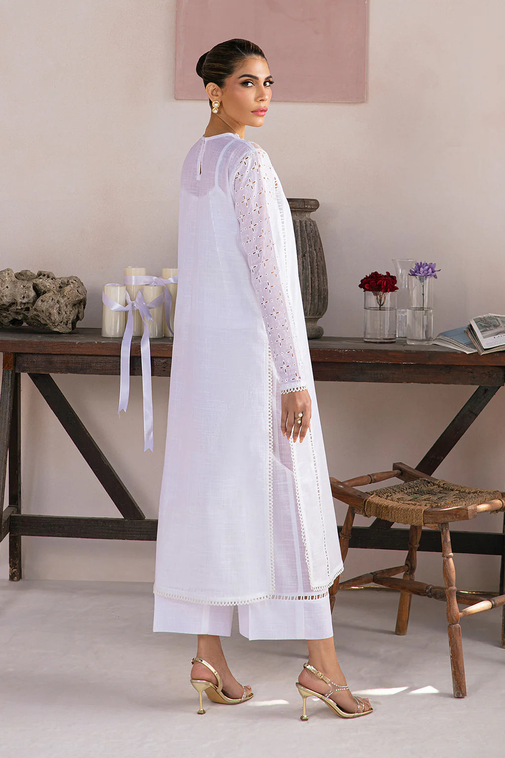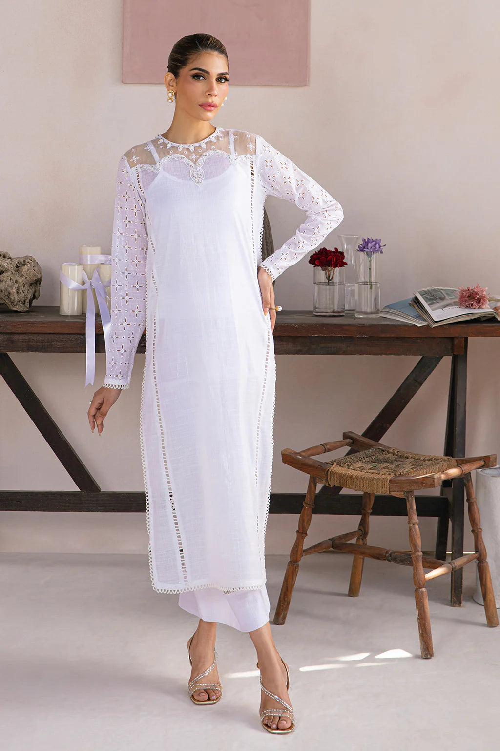 White embroidered lawn shirt with cut worked sleeves paired with white culottes