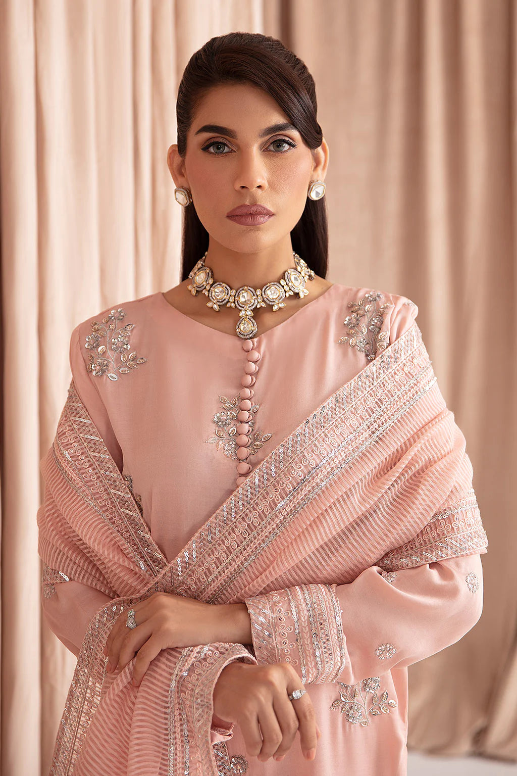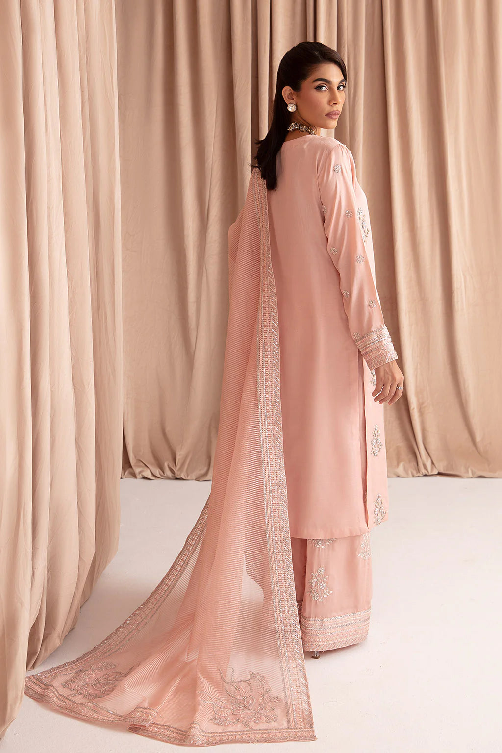 Kattan silk pink hued ensemble adorned with intricate details.
