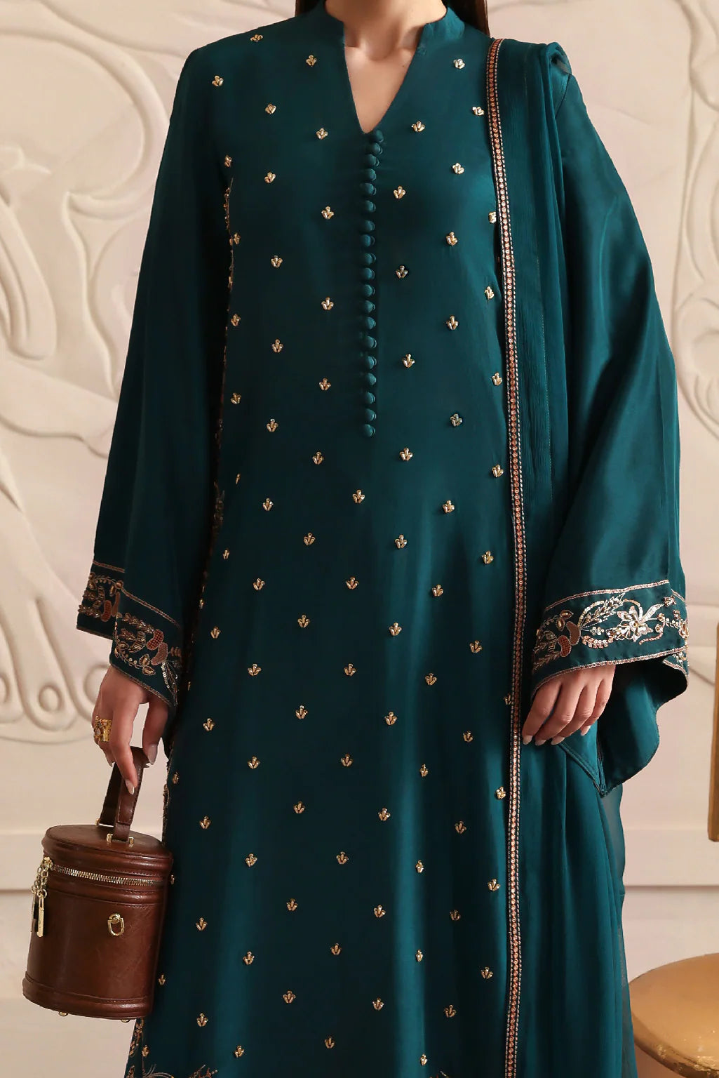 Long teal shirt richly embroidered and embellished with flared sleeves, paired with cigarette pants and a chiffon dupatta finished with embroidered borders