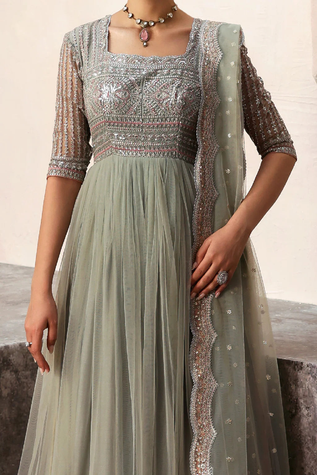 Ash gray net pishwas with intricate sequin embroidery and double sequin borders, paired with raw silk foil-printed trousers and an embroidered scalloped dupatta for a graceful festive look.