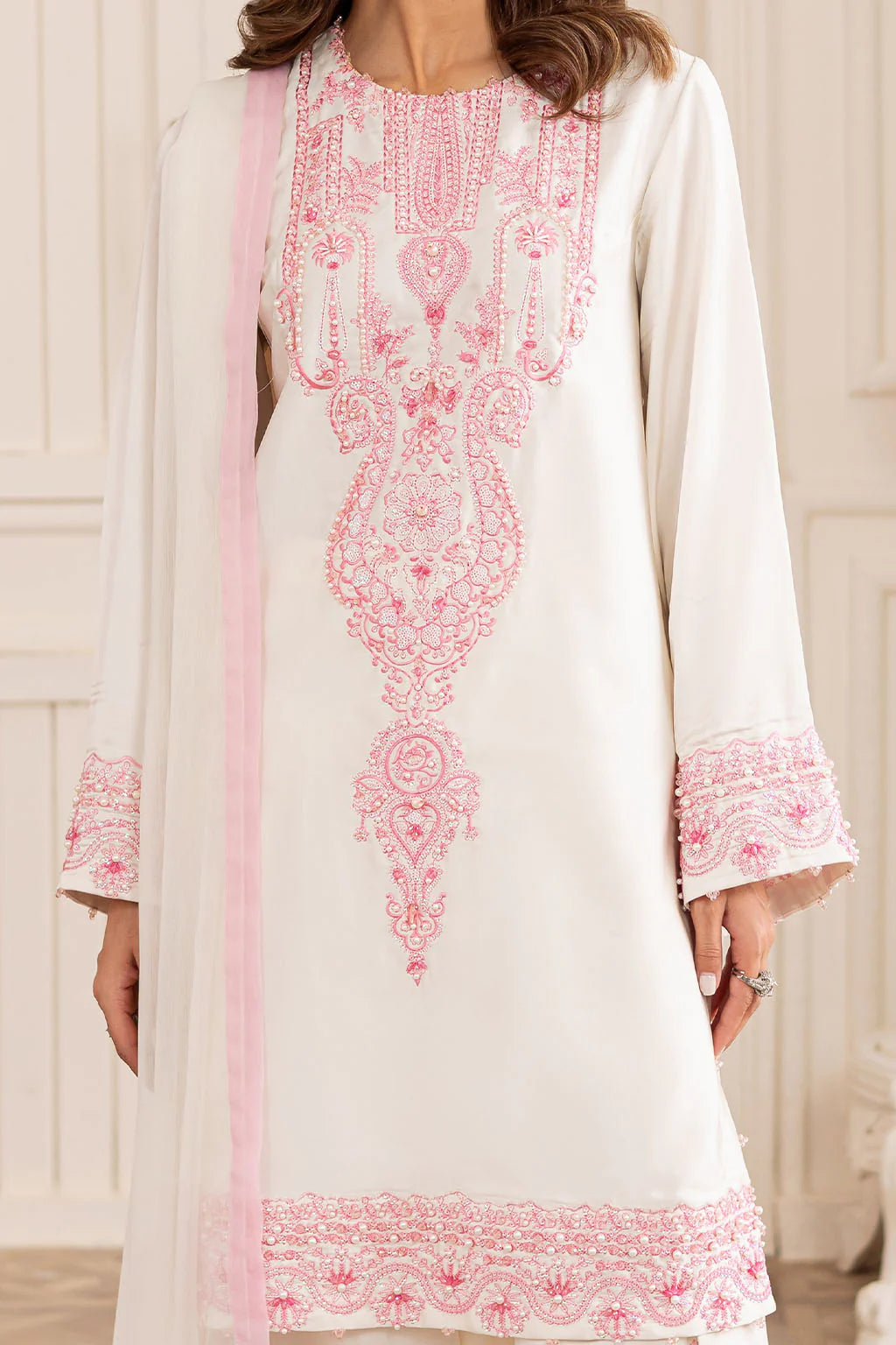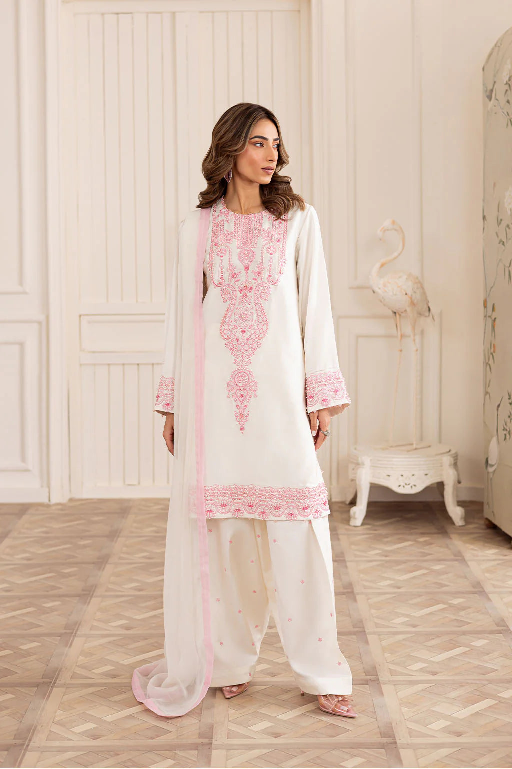 A off white charmeuse embroidered and hand embellished shirt, paired with embroidered shalwar and chiffon dupatta