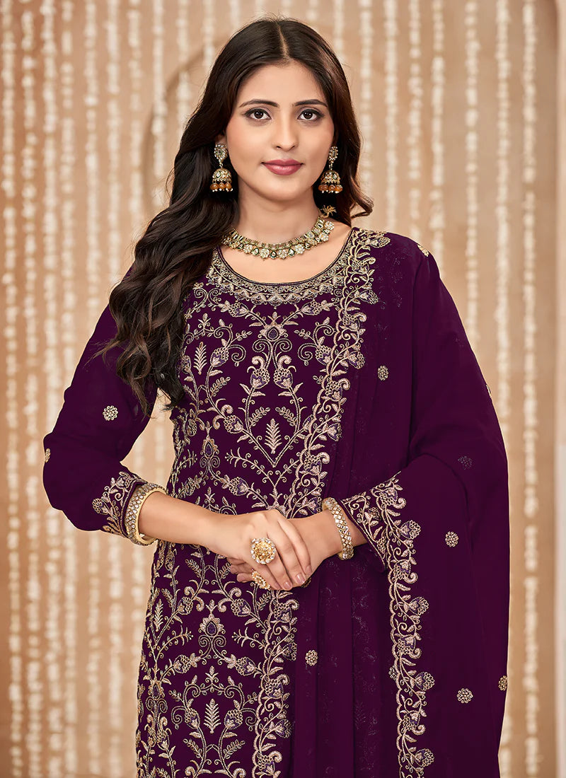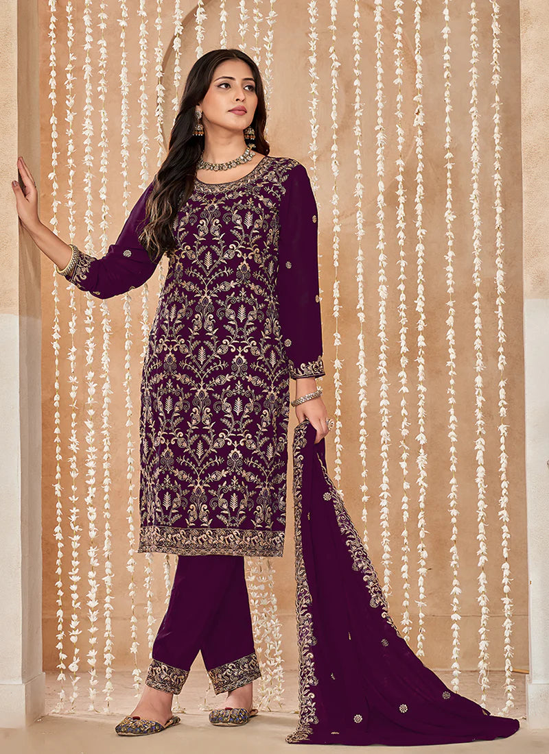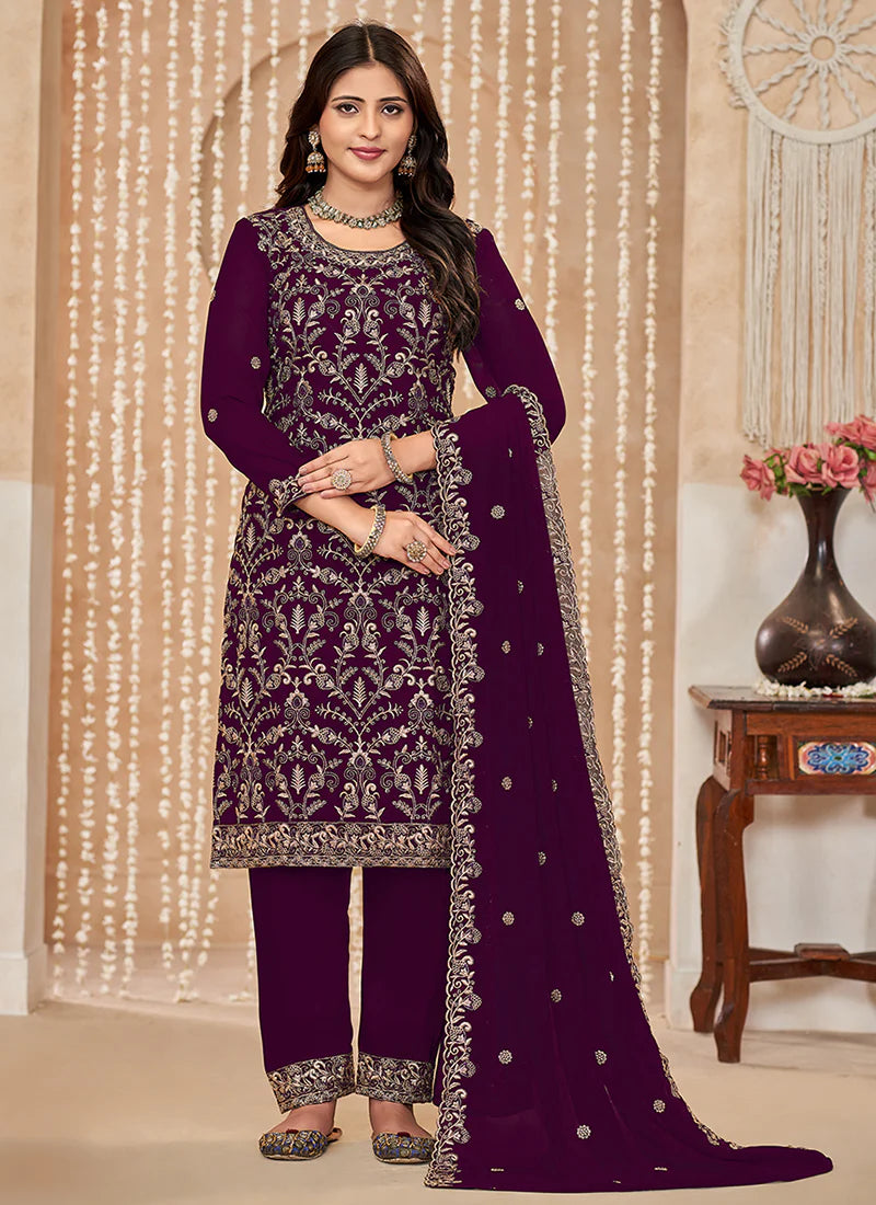 Wine Embroidered Pant Style Suit features a georgette kameez with embroidery work. Comes with santool inner and bottom alongwith georgette embroidered dupatta.