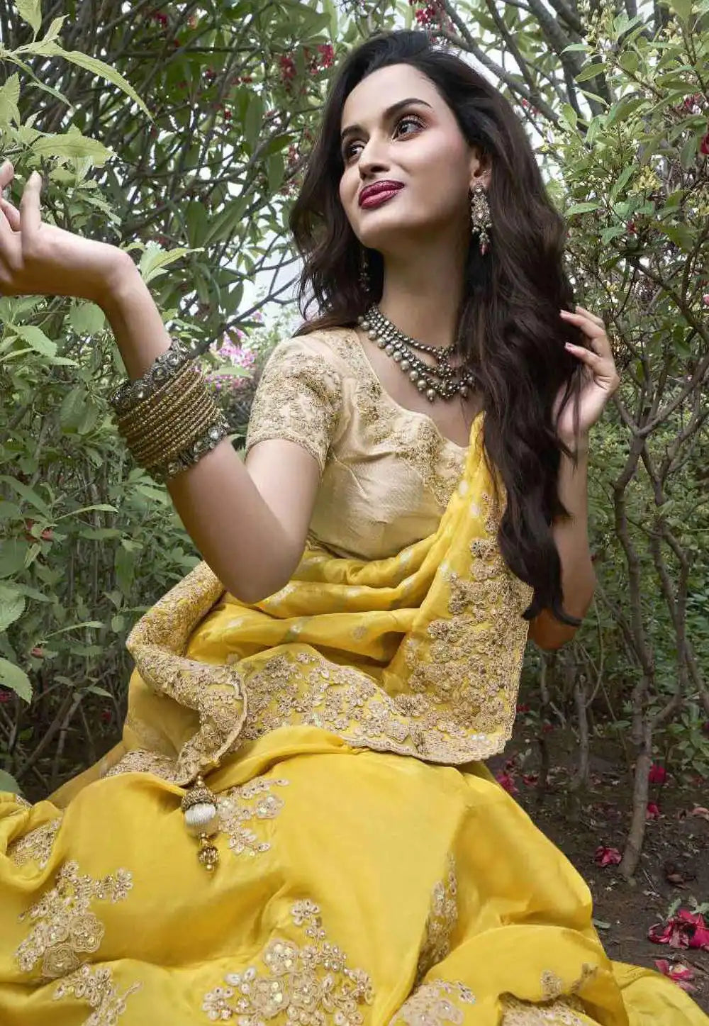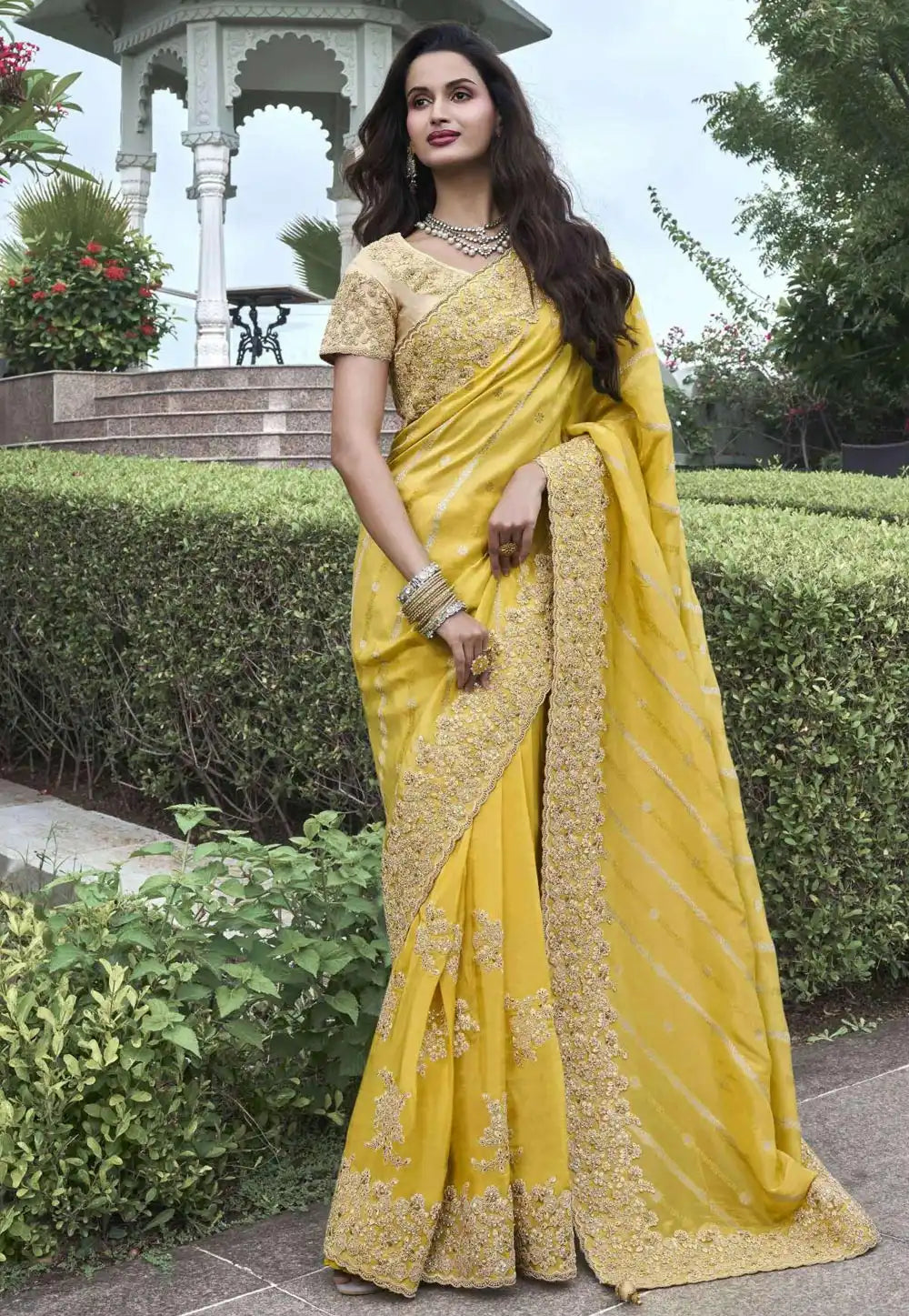 Yellow Embroidered Wedding Saree features a silk scalloped saree in enhanced with dangles, zari woven in floral motifs and resham, zari, sequins border work. Comes with silk embroidered blouse.